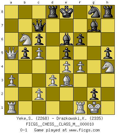 Last move : 0-1 2007 September 12 14:4:17 [Event "FICGS__CHESS__CLASS_M__000010"] [Site "FICGS"] [Date "2007.03.28"] [Round "1"] [White "Yeke,Serkan"] [Black "Drazkowski,Krzysztof"] [Result "0-1"] [WhiteElo "2268"] [BlackElo "2335"] 1.e4 c5 2.Nf3 Nc6 3.Bb5 g6 4.Bxc6 dxc6 5.d3 Bg7 6.Nc3 e5 7.Be3 b6 8.h3 Qc7 9.a3 a5 10.Qd2 f6 11.O-O Be6 12.Na4 h5 13.b4 g5 14.bxc5 b5 15.Nb6 Rd8 16.Qxa5 g4 17.Nh4 gxh3 18.f4 hxg2 0-1 This chess game has been lost on time (started : 2007.03.28 15:12:14) Sicilian : Nimzovich-Rossolimo attack (with ...g6, without ...d6) Kingside Castling by player White (move 11) Player Black won this chess game. Follow this game move after move (download)In the perfect Chess combination as in a first-rate short story, the whole plot and counter-plot should lead up to a striking finale, the interest not being allayed until the very last moment. (Yates and Winter) Ich bin Weltmeister und muß mit niemandem irgend etwas diskutieren. (Viswanathan Anand) Te sientas frente a un tablero y repentinamente tu corazón brinca. Tu mano tiembla al tomar una pieza y moverla. Pero lo que el Ajedrez te enseña es que tu debes permanecer ahí con calma y pensar de que si realmente es una buena idea o de que si hay otras ideas mejores. (Stanley Kubrick) Les ravages du H expliquent la différence de niveau entre Tal et Thal [Abergel]. The difference between perseverance and obstinacy is that one comes from a strong will, and the other from a strong won't. (Henry Ward Beecher)