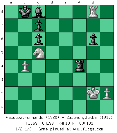 Last move : 1/2-1/2 2016 December 27 11:19:2 [Event "FICGS__CHESS__RAPID_A__000193"] [Site "FICGS"] [Date "2016.10.01"] [Round "1"] [White "Vasquez,Fernando"] [Black "Salonen,Jukka"] [Result "1/2-1/2"] [WhiteElo "1920"] [BlackElo "1917"] 1.e4 e5 2.Nf3 Nc6 3.d4 exd4 4.Nxd4 Nf6 5.Nxc6 bxc6 6.e5 Qe7 7.Qe2 Nd5 8.c4 Ba6 9.b3 g6 10.f4 d6 11.Qf2 Nf6 12.Ba3 Qe6 13.Be2 dxe5 14.fxe5 Qxe5 15.O-O O-O-O 16.Bxf8 Rhxf8 17.Qxf6 Qxe2 18.Nc3 Qe3+ 19.Kh1 Qd4 20.Rae1 Bb7 21.Qxd4 Rxd4 22.Kg1 f5 23.Ne4 Kb8 24.Nc5 Bc8 25.Re7 f4 26.Rxh7 Rf5 27.b4 Rxc4 28.Rh8 f3 29.Rxf3 Rxf3 30.gxf3 a5 31.a3 Rc3 32.Rg8 axb4 33.axb4 Rxf3 34.Nd7+ Kb7 35.Kg2 Rf4 36.Nc5+ Kb8 1/2-1/2 Scotch : Mieses variation Kingside Castling by player White (move 15) Queenside Castling by player Black (move 15) This chess game ended in a draw. Follow this game move after move (download)Who is your opponent tonight, tonight I am playing against the Black pieces. (Akiba Rubinstein) Zu meiner Zeit war ein 20 jähriger ein junger Spieler, heute ist er ein Veteran. (Garry Kasparov) El Ajedrez, como cualquier otra actividad creativa, puede existir solo a través de méritos combinados de aquellos que tienen talento creativo y de aquellos que tienen la habilidad de organizar un trabajo creativo. (Mikhail Botvinnik) La vérité est comme le meilleur coup aux échecs : elle existe, mais il faut la chercher. (Arturo Perez-Reverte) Nothing is more important for teaching us to understand the concepts we have than constructing fictitious ones. (Ludwig Wittgenstein)