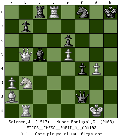 Last move : 0-1 2016 November 30 6:24:6 [Event "FICGS__CHESS__RAPID_A__000193"] [Site "FICGS"] [Date "2016.10.01"] [Round "1"] [White "Salonen,Jukka"] [Black "Munoz Portugal,Guillermo"] [Result "0-1"] [WhiteElo "1917"] [BlackElo "2063"] 1.e4 c6 2.d4 e6 3.Nf3 d5 4.e5 c5 5.dxc5 Bxc5 6.Bd3 Ne7 7.O-O Nbc6 8.Nbd2 Bb6 9.Nb3 Ng6 10.Re1 O-O 11.Be3 Bc7 12.Bd4 Nf4 13.Bb5 Nxd4 14.Qxd4 Ng6 15.Bd3 Bb6 16.Qg4 f5 17.Qg3 Bd7 18.c4 dxc4 19.Bxc4 Rc8 20.Rac1 Rc7 21.Rc3 Qe7 22.h4 Rfc8 23.Rec1 Nf8 24.Nbd4 Kh8 25.a3 h6 26.Qf4 Be8 27.Qd2 Bh5 28.b4 Rd7 29.Rd3 Rd7d8 30.R1c3 a5 31.Ba2 Ra8 32.Rb3 axb4 33.Qxb4 Bc5 34.Qb5 Rac8 35.Rb1 f4 36.Rd2 g5 37.hxg5 hxg5 38.Nb3 Bxf3 39.gxf3 g4 40.fxg4 Qh4 41.Rxd8 Qxf2 0-1 Caro-Kann defense Kingside Castling by player White (move 7) Kingside Castling by player Black (move 10) Player Black won this chess game. Follow this game move after move (download)By the beauty of his games, the clarity of his play, and the brilliance of his ideas, Fischer made himself an artist of the same stature as Brahms, Rembrandt, and Shakespeare. (David Levy) Pläne sind die Träume des Verständigen. (Ernst Freiherr von Feuchtersleben) Todavía soy una víctima del Ajedrez. Tiene toda la belleza del arte y mucho mas. No puede ser comercializado. El Ajedrez es mas puro que el arte en su posición social. (Marcel Duchamp) Il vaut mieux sacrifier les pièces de l'adversaire. (Xavier Tartacover) Think like a man of action, act like a man of thought. (Henri Louis Bergson)