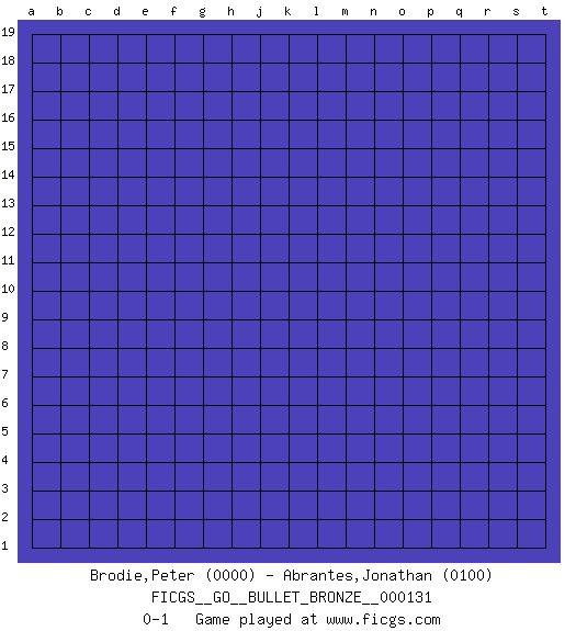 Last move : 0-1 2016 October 3 2:1:10 [Event "FICGS__GO__BULLET_BRONZE__000131"] [Site "FICGS"] [Date "2016.10.03"] [Round "1"] [Black "Brodie,Peter"] [White "Abrantes,Jonathan"] [Result "0-1"] [Rating 1 "0000"] [Rating 2 "0100"] 0-1 This go game has been lost on time (started : 2016.10.03 1:28:57) Here are the names of the openings (joseki) played in the four corners : Player White won this Go (weiqi, baduk) game. Follow this game move after move (download)Win the stones, lose the game. (Anonymous) As a goal marker shodan is important. As a destination it is a poor place to stop. (Thomas Tamayo)