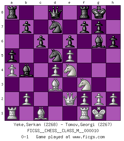 Last move : 0-1 2007 July 30 19:24:48 [Event "FICGS__CHESS__CLASS_M__000010"] [Site "FICGS"] [Date "2007.03.28"] [Round "1"] [White "Yeke,Serkan"] [Black "Tomov,Georgi"] [Result "0-1"] [WhiteElo "2268"] [BlackElo "2267"] 1.d4 d5 2.Nf3 Nf6 3.c4 c6 4.Nc3 dxc4 5.a4 Bf5 6.e3 e6 7.Bxc4 Bb4 8.O-O Nbd7 9.Qe2 Bg6 10.e4 O-O 11.e5 Nd5 12.Ne4 a5 13.Bd3 h6 0-1 This chess game has been lost on time (started : 2007.03.28 15:12:14) Queen's pawn game Kingside Castling by player White (move 8) Kingside Castling by player Black (move 10) Player Black won this chess game. Follow this game move after move (download)Botvinnik tried to take the mystery out of Chess, always relating it to situations in ordinary life. He used to call Chess a typical inexact problem similar to those which people are always having to solve in everyday life. (Garry Kasparov) Im Fernschach kannst du während dem Spiel rauchen. (John Christen Knudsen) El arma más poderosa en el Ajedrez, es tener la próxima movida. (David Bronstein) La vie et les Echecs sont tous les deux une lutte constante. (Lasker) There will be no order, only chaos. (Sol Robeson in Pi by Darren Aronofsky)