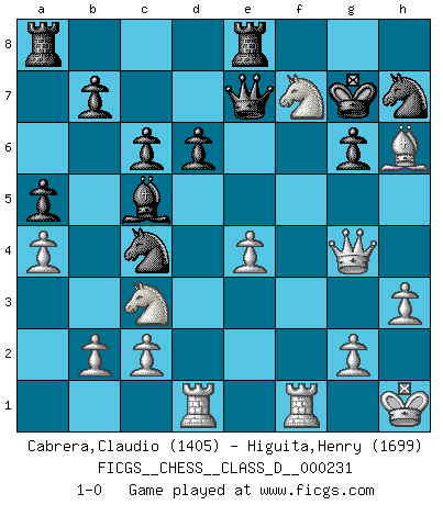 Last move : 1-0 2017 January 27 15:35:17 [Event "FICGS__CHESS__CLASS_D__000231"] [Site "FICGS"] [Date "2016.10.07"] [Round "1"] [White "Cabrera,Claudio"] [Black "Higuita,Henry"] [Result "1-0"] [WhiteElo "1405"] [BlackElo "1699"] 1.e4 e5 2.Nc3 Nf6 3.Bc4 Bc5 4.h3 O-O 5.d3 h6 6.Nge2 c6 7.Bd2 a5 8.a4 d6 9.Ng3 Be6 10.O-O Nh7 11.Kh1 Nd7 12.f4 Bxc4 13.dxc4 exf4 14.Bxf4 Ne5 15.Nf5 Nxc4 16.Qg4 g6 17.Nxh6+ Kg7 18.Nf5+ Kg8 19.Rad1 Re8 20.Nh6+ Kg7 21.Nxf7 Qe7 22.Bh6+ 1-0 Vienna game Kingside Castling by player Black (move 4) Kingside Castling by player White (move 10) Player White won this chess game. Follow this game move after move (download)Bobby Fischer is the greatest Chess genius of all time ! (Alexander Kotov) Karpov ist ein Museumsstück. (Garry Kasparov) Cuando me preguntan: -¿Cual es el secreto que te hace hacer mejores movidas que tus oponentes?, Yo respondo: Me da gusto que me pregunten eso, porque, como veran, hay una simple razón. Yo pienso mis propias movidas y dejo a mi oponente que el piense las suyas. (Alexander Alekhine) Ce n'est pas pour s'amuser qu'il joue aux échecs : il célèbre un culte. (Vladimir Nabokov) How many people work in NATO Headquarters ? - About half of them. (Dirk Stikker, NATO general secretary)