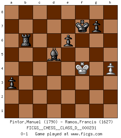Last move : 0-1 2017 January 13 14:15:57 [Event "FICGS__CHESS__CLASS_D__000231"] [Site "FICGS"] [Date "2016.10.07"] [Round "1"] [White "Pintor,Manuel"] [Black "Ramos,Francis"] [Result "0-1"] [WhiteElo "1790"] [BlackElo "1627"] 1.e4 c5 2.Nc3 d6 3.g3 Nc6 4.f4 a6 5.Bc4 e6 6.Nf3 b5 7.Be2 Nf6 8.O-O b4 9.Na4 Nxe4 10.d4 cxd4 11.Nxd4 Bb7 12.Bf3 Nxd4 13.Qxd4 d5 14.Bxe4 dxe4 15.Be3 Qxd4 16.Bxd4 h5 17.Nc5 Rd8 18.Be3 Bxc5 19.Bxc5 h4 20.g4 h3 21.Bxb4 e3 22.Rfe1 Rh4 23.g5 Rg4+ 24.Kf1 Rxf4+ 25.Ke2 Rxb4 26.Kxe3 Re4+ 27.Kf2 Rd2+ 28.Kg3 Rxe1 29.Rxe1 Rxc2 30.Kxh3 Rxb2 31.g6 Rxa2 32.gxf7+ Kxf7 33.Rc1 Bd5 34.Rb1 a5 35.Rb6 a4 36.Kg3 a3 37.h4 Rb2 38.Kf4 Rxb6 0-1 Sicilian : Closed Kingside Castling by player White (move 8) 10 pieces endgame at move 32 : White KRPP , Black KRBPPP WHITE : King + 1 Rook 2 Pawns BLACK : King + 1 Rook 1 Bishop 3 Pawns 9 pieces endgame at move 32 : White KRP , Black KRBPPP WHITE : King + 1 Rook 1 Pawn BLACK : King + 1 Rook 1 Bishop 3 Pawns 8 pieces endgame at move 38 : White KP , Black KRBPPP WHITE : King + 1 Pawn BLACK : King + 1 Rook 1 Bishop 3 Pawns Player Black won this chess game. Follow this game move after move (download)The older I grow, the more I value pawns. (Paul Keres) Es ist peinlich, dass ich nie Weltmeister wurde. Es wäre leicht, Leonid Breschnjew als Ursache vorzuschieben, dessen Apparat den Vorzeigekommunisten Anatoli Karpow in allem unterstützte. Aber Garri Kasparow zum Beispiel, der ebenfalls von den Sowjets unerwünscht war, hat trotz der Widerstände den WM-Titel erobert. (Viktor Kortschnoi) Si no le temes a Spassky, entonces elimino el elemento del dinero. (Jim Slater) Karpov est une pièce de musée. (Garry Kasparov) Luck is what you have left over after you give 100 percent. (Langston Coleman)