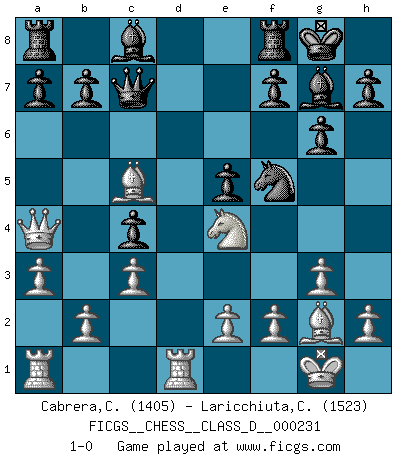 Last move : 1-0 2016 December 11 20:9:7 [Event "FICGS__CHESS__CLASS_D__000231"] [Site "FICGS"] [Date "2016.10.07"] [Round "1"] [White "Cabrera,Claudio"] [Black "Laricchiuta,Claudio"] [Result "1-0"] [WhiteElo "1405"] [BlackElo "1523"] 1.c4 c5 2.g3 Nf6 3.Bg2 d5 4.cxd5 Nxd5 5.Nc3 Nb4 6.Nf3 N8c6 7.O-O g6 8.a3 Nd5 9.Qb3 Nxc3 10.dxc3 Bg7 11.Rd1 Qc7 12.Bf4 e5 13.Be3 Ne7 14.Ng5 O-O 15.Ne4 c4 16.Qa4 Nf5 17.Bc5 1-0 English : Symmetrical variation Kingside Castling by player White (move 7) Kingside Castling by player Black (move 14) Player White won this chess game. Follow this game move after move (download)First-class players lose to second-class players because second-class players sometimes play a first-class game. (Siegbert Tarrasch) Schon mancher Spieler hat aufgegeben, um zu vermeiden, daß er eine Figur verliert. (Savielly Grigorievitsch Tartakower) El jugador táctico sabe que hacer cuando hay algo que hacer; mientras que el estratega sabe que hacer cuando no hay nada que hacer. (Gerald Abrahams) Mais n'est-ce pas déjà le limiter injurieusement que d'appeler les échecs un jeu? N'est-ce pas aussi une science, un art, ou quelque chose qui, comme le cercueil de Mahomet entre ciel et terre, est suspendu entre l'un et l'autre, et qui réunit un nombre incroyable de contraires ? (Stefan Zweig) But they are useless. They can only give you answers. (Pablo Picasso, about computers)