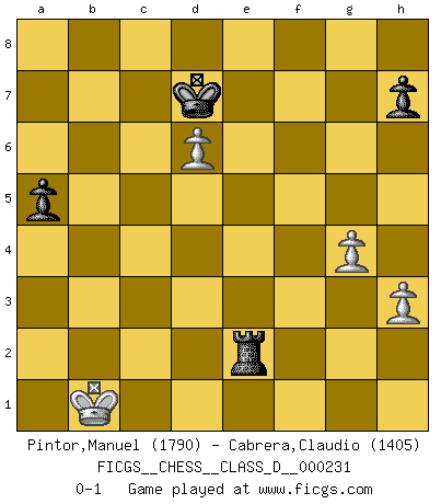 Last move : 0-1 2016 October 17 19:41:35 [Event "FICGS__CHESS__CLASS_D__000231"] [Site "FICGS"] [Date "2016.10.07"] [Round "1"] [White "Pintor,Manuel"] [Black "Cabrera,Claudio"] [Result "0-1"] [WhiteElo "1790"] [BlackElo "1405"] 1.e4 e5 2.f4 d5 3.exd5 e4 4.Nc3 Nf6 5.Bb5+ c6 6.dxc6 bxc6 7.Bc4 Bc5 8.Nge2 O-O 9.d4 exd3 10.cxd3 Re8 11.Qb3 Qe7 12.Bd2 Nbd7 13.O-O-O Nb6 14.d4 Nxc4 15.Qxc4 Bd6 16.Rhe1 Be6 17.Qxc6 Rec8 18.Qa4 Rc4 19.Qa5 Bb4 20.Qg5 Qb7 21.Kb1 Rb8 22.b3 Ne4 23.Qb5 Qxb5 24.Nxb5 Nxd2+ 25.Ka1 Rc2 26.Nbc3 Bg4 27.h3 Bxc3+ 28.Nxc3 Bxd1 29.Rxd1 Nxb3+ 30.axb3 Rxc3 31.d5 Kf8 32.d6 Ke8 33.Re1+ Kd8 34.Re7 a5 35.Rxf7 Rcxb3 36.Rxg7 R8b4 37.Ka2 Rb2+ 38.Ka1 Re2 39.f5 Rf4 40.Rb7 Rxf5 41.g4 Rf1+ 42.Rb1 Rxb1+ 43.Kxb1 Kd7 0-1 KGD : Falkbeer, 3...e4 Kingside Castling by player Black (move 8) Queenside Castling by player White (move 13) 10 pieces endgame at move 40 : White KRPPP , Black KRRPP WHITE : King + 1 Rook 3 Pawns BLACK : King + 2 Rooks 2 Pawns 9 pieces endgame at move 42 : White KPPP , Black KRRPP WHITE : King + 3 Pawns BLACK : King + 2 Rooks 2 Pawns 8 pieces endgame at move 43 : White KPPP , Black KRPP WHITE : King + 3 Pawns BLACK : King + 1 Rook 2 Pawns Player Black won this chess game. Follow this game move after move (download)For me, Chess is life and every game is like a new life. Every Chess player gets to live many lives in one lifetime. (Eduard Gufeld) Spielt Blackmar-Diemer-Gambit, und das Matt kommt von selbst! (Emil Joseph Diemer) Evita las multitudes. Haz independientemente tu propio razonamiento. Trata de ser el jugador de Ajedrez, no la pieza de Ajedrez. (Ralph Charell) Demandez au pauvre Cg1 ce qu'il en pense. Eduard Gufeld à propos de la variante Saemisch de l'Est-Indienne. Chess is as much a mystery as women. (Purdy)