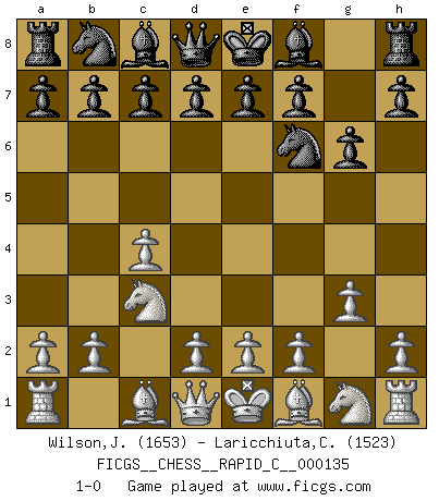 Last move : 1-0 2016 November 23 18:17:14 [Event "FICGS__CHESS__RAPID_C__000135"] [Site "FICGS"] [Date "2016.10.08"] [Round "1"] [White "Wilson,Jaimie"] [Black "Laricchiuta,Claudio"] [Result "1-0"] [WhiteElo "1653"] [BlackElo "1523"] 1.c4 Nf6 2.Nc3 g6 3.g3 1-0 This chess game has been lost on time (started : 2016.10.08 11:51:19) English Opening Player White won this chess game. Follow this game move after move (download)Personally, I rather look forward to a computer program winning the world Chess Championship. Humanity needs a lesson in humility. (Richard Dawkings) Im Internet Chess Club betrug mein Rating vorübergehend 3350 ELO-Punkte. (Sergej Karjakin) De eso se trata el Ajedrez. Un día le das una lección a tu oponente y al día siguiente el te da una a tí. (Bobby Fischer) Les Echecs ont trois composantes : le temps, l'espace et le matériel en dernier. (Mikhail Tal) Unless I accept my faults I will most certainly doubt my virtues. (Hugh Prather)