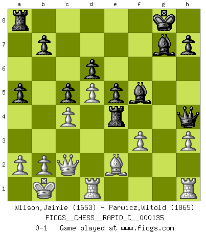 Last move : 0-1 2016 December 29 2:41:40 [Event "FICGS__CHESS__RAPID_C__000135"] [Site "FICGS"] [Date "2016.10.08"] [Round "1"] [White "Wilson,Jaimie"] [Black "Parwicz,Witold"] [Result "0-1"] [WhiteElo "1653"] [BlackElo "1865"] 1.d4 Nf6 2.c4 g6 3.Nc3 Bg7 4.e4 d6 5.Nf3 O-O 6.h3 e5 7.d5 a5 8.Be3 Na6 9.Be2 Nc5 10.Nd2 Ne8 11.g4 f5 12.gxf5 gxf5 13.Bxc5 dxc5 14.Qc2 Qh4 15.O-O-O Nd6 16.Nb5 fxe4 17.Nxd6 cxd6 18.Nxe4 Rf4 19.f3 Bf5 20.Kb1 Rxe4 0-1 King's Indian : 5.Nf3 Kingside Castling by player Black (move 5) Queenside Castling by player White (move 15) Player Black won this chess game. Follow this game move after move (download)The most important feature of the Chess position is the activity of the pieces. This is absolutely fundamental in all phases of the game: Opening, Middlegame and especially Endgame. The primary constraint on a piece's activity is the Pawn structure. (Michael Stean) Ein Isolani verdüstert die Stimmung auf dem ganzen Schachbrett. (Savielly Grigorievitsch Tartakower) Cuando veas una buena jugada, trata de encontrar otra mejor. (Emanuel Lasker) Il vaut toujours mieux jouer un plan faux de façon logique que de n'avoir pas de plan du tout. (Victor Kortchnoï) Creativity is inventing, experimenting, growing, taking risks, breaking rules, making mistakes, and having fun. (Mary Lou Cook)