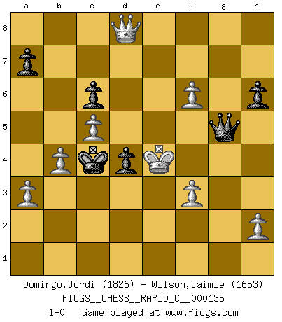 Last move : 1-0 2017 January 28 1:42:55 [Event "FICGS__CHESS__RAPID_C__000135"] [Site "FICGS"] [Date "2016.10.08"] [Round "1"] [White "Domingo,Jordi"] [Black "Wilson,Jaimie"] [Result "1-0"] [WhiteElo "1826"] [BlackElo "1653"] 1.e4 e5 2.Nf3 Nc6 3.Bc4 Bc5 4.c3 Nf6 5.d4 exd4 6.e5 d5 7.Bb5 Ne4 8.cxd4 Bb4+ 9.Bd2 Nxd2 10.Bxc6+ bxc6 11.Nbxd2 O-O 12.O-O c5 13.a3 Bxd2 14.Qxd2 Bg4 15.dxc5 Bxf3 16.gxf3 c6 17.f4 Qd7 18.Kh1 f6 19.Qe3 Rae8 20.Rae1 Qf5 21.Qg3 Re6 22.Rg1 g6 23.Re2 d4 24.Rge1 Rd8 25.Rd2 Kf7 26.Rd3 h6 27.b4 g5 28.fxg5 Rxe5 29.Rxe5 Qxe5 30.gxf6 Qe1+ 31.Qg1 Qe4+ 32.f3 Qxd3 33.Qg7+ Ke6 34.Qe7+ Kd5 35.Qxd8+ Kc4 36.Kg2 Qc2+ 37.Kg3 Qg6+ 38.Kf4 Qg5+ 39.Ke4 1-0 Giuoco Piano Kingside Castling by player Black (move 11) Kingside Castling by player White (move 12) Player White won this chess game. Follow this game move after move (download)Chess is a more highly symbolic game, but the aggressions are therefore even more frankly represented in the play. It probably began as a war game; that is, the representation of a miniature battle between the forces of two kingdoms. (Karl Meninger) Vielleicht wirkt die Aura früherer Spieler glanzvoller als die der heutigen Spieler, aber das liegt daran, dass man kein Programm wie Fritz hatte, das einem all die Löcher in ihren Partien zeigt. (Vladimir Kramnik) Aunque la mayoría de la gente disfruta observar las partidas de los grandes Maestros de ataque, algunos de los jugadores mas notables en la historia han sido los jugadores silenciosos posicionales. Lentamente ellos te aplastan despojandote de tu espacio, congestionando tus piezas y dejandote virtualmente sin nada que hacer. (Yasser Seirawan) Vouloir jouer aux échecs contre soi-même est aussi paradoxal que vouloir marcher sur son ombre. (Stefan Zweig) Now you put water in a cup, it becomes the cup; You put water into a bottle it becomes the bottle; You put it in a teapot it becomes the teapot. Water can flow or it can crash. Be water, my friend. (Bruce Lee)