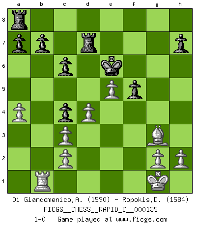 Last move : 1-0 2017 January 14 12:1:30 [Event "FICGS__CHESS__RAPID_C__000135"] [Site "FICGS"] [Date "2016.10.08"] [Round "1"] [White "Di Giandomenico,Alfonso"] [Black "Ropokis,Dimitrios"] [Result "1-0"] [WhiteElo "1590"] [BlackElo "1584"] 1.e4 e5 2.Bc4 Nf6 3.d3 Nc6 4.Nc3 Bb4 5.f4 Bxc3+ 6.bxc3 O-O 7.Nf3 d5 8.fxe5 dxc4 9.exf6 Qxf6 10.Bd2 Bg4 11.O-O Ne5 12.Nxe5 Bxd1 13.Rxf6 gxf6 14.Nd7 Rfd8 15.Nxf6+ Kg7 16.Rxd1 Kxf6 17.a4 Ke5 18.Bg5 f6 19.Bh4 Rd7 20.Bg3+ Ke6 21.d4 c6 22.Rb1 f5 23.e5 1-0 This chess game has been lost on time (started : 2016.10.08 11:51:19) Bishop's Opening : Berlin defense Kingside Castling by player Black (move 6) Kingside Castling by player White (move 11) Player White won this chess game. Follow this game move after move (download)All my games are real. (Bobby Fischer) Die Leute spielen gegen mich seit 15 Jahren unter Ihren Möglichkeiten. (Robert James Fischer) Si el ingenio solamente fuese necesario para lucirse, las mujeres serían las mejores jugadoras de Ajedrez del mundo. (Albin) On entre au jeu d'Echecs comme on entre en Religion. Pour le joueur d'Echecs, la partie d'Echecs c'est l'office, la messe, le défilé du 1er Mai, le dépôt de gerbe au Monument aux Morts. C'est un drame sacré. (Michel Roos) The existence of forgetting has never been proved: We only know that some things don't come to mind when we want them. (Friedrich Nietzsche)