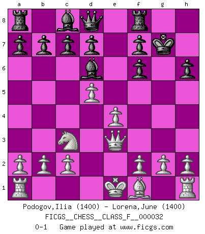 Last move : 0-1 2007 June 10 6:57:10 [Event "FICGS__CHESS__CLASS_F__000032"] [Site "FICGS"] [Date "2007.03.29"] [Round "1"] [White "Podogov,Ilia"] [Black "Lorena,June"] [Result "0-1"] [WhiteElo "1400"] [BlackElo "1400"] 1.e4 e5 2.Nf3 Nc6 3.Nc3 Nf6 4.d4 Bd6 5.d5 Nd4 6.Nxd4 exd4 7.Qxd4 O-O 8.Bg5 h6 9.Bxf6 gxf6 10.Qe3 Kg7 0-1 Four knights : Scotch variation Kingside Castling by player Black (move 7) Player Black won this chess game. Follow this game move after move (download)The tactician must know what to do whenever something needs doing; the strategist must know what to do when nothing needs doing. (Savielly Tartakover) Im Hotelzimmer gab es nur zwei Schaben. (Über die Turnierbedingungen) (Peter Swidler) Vive, pierde y aprende al observar a tu oponente como gana. (Amber Steenbock) Les Echecs ne sont pas pour les âmes timides. Ils requièrent un homme entier, qui ne s'arrête pas aveuglément à ce qui a été déjà établi, mais qui tente individuellement de sonder les profondeurs du jeu. (W. Steinitz) The greatest con, that he ever pulled... was making you believe... that he is you. (Revolver, movie)