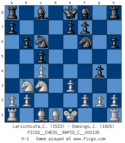 Last move : 0-1 2016 November 19 17:1:49 [Event "FICGS__CHESS__RAPID_C__000135"] [Site "FICGS"] [Date "2016.10.08"] [Round "1"] [White "Laricchiuta,Claudio"] [Black "Domingo,Jordi"] [Result "0-1"] [WhiteElo "1523"] [BlackElo "1826"] 1.Nf3 h6 2.d4 Nf6 3.c4 g5 4.e3 d6 5.Be2 c5 6.dxc5 g4 7.Nd4 dxc5 8.Nb3 Qxd1+ 9.Bxd1 b6 10.Nc3 Nc6 0-1 This chess game has been lost on time (started : 2016.10.08 11:51:19) Reti Opening Player Black won this chess game. Follow this game move after move (download)Dazzling combinations are for the many, shifting wood is for the few. (Georg Kieninger) Wenn du auf das Glück wartest, wird das Leben ziemlich langweilig. (Mikhail Nekhemyevich Tal) Alguna parte de un error es siempre correcto. (Savielly Tartakover) Demandez au pauvre Cg1 ce qu'il en pense. Eduard Gufeld à propos de la variante Saemisch de l'Est-Indienne. Chess is everything: art, science and sport. (Anatoly Karpov)