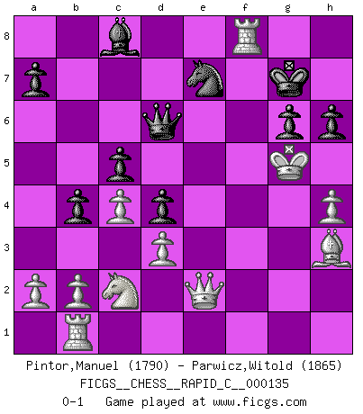 Last move : 0-1 2016 November 28 18:57:54 [Event "FICGS__CHESS__RAPID_C__000135"] [Site "FICGS"] [Date "2016.10.08"] [Round "1"] [White "Pintor,Manuel"] [Black "Parwicz,Witold"] [Result "0-1"] [WhiteElo "1790"] [BlackElo "1865"] 1.e4 c5 2.Nc3 Nc6 3.g3 g6 4.Bg2 Bg7 5.d3 d6 6.f4 e6 7.Nf3 Nge7 8.O-O O-O 9.Be3 Nd4 10.h3 Rb8 11.Rb1 b6 12.Kh2 Nxf3+ 13.Qxf3 Bb7 14.Qg4 d5 15.Bf2 d4 16.Nb5 f5 17.Qe2 Qd7 18.Na3 b5 19.c4 b4 20.Nc2 e5 21.fxe5 Bxe5 22.exf5 Rxf5 23.h4 Rbf8 24.Bh3 Rxf2+ 25.Rxf2 Bxg3+ 26.Kxg3 Qd6+ 27.Kg4 Bc8+ 28.Kg5 Kg7 29.Rxf8 h6+ 0-1 Sicilian : Closed, 6.f4 Kingside Castling by player White (move 8) Kingside Castling by player Black (move 8) Player Black won this chess game. Follow this game move after move (download)That's what Chess is all about. One day you give your opponent a lesson, the next day he gives you one. (Bobby Fischer) Taktik ist was man tun muß, wenn etwas zu tun ist. Strategie ist was man tun muß, wenn nichts zu tun ist. (Savielly Grigorievitsch Tartakower) Tu cuerpo tiene que estar en óptima condición. Tu Ajedrez se deteriora como lo hace tu cuerpo. No puedes separar la mente y el cuerpo. (Bobby Fischer) Il a essayé de se convaincre qu'il pourrait empêcher toutes les erreurs et ne jamais perdre. L'horreur ! Gary Kasparov au sujet de Robert Fischer. The man who strikes first admits that his ideas have given out. (Chinese proverb)