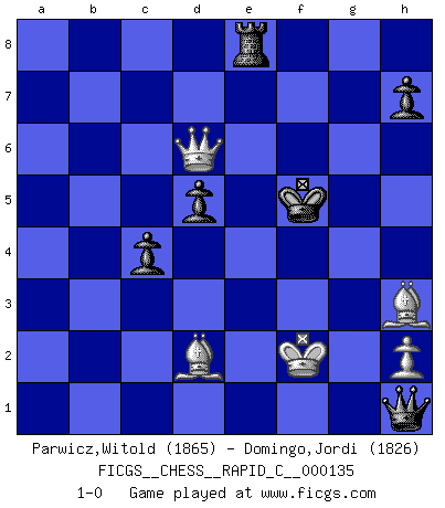 Last move : 1-0 2017 January 9 20:3:54 [Event "FICGS__CHESS__RAPID_C__000135"] [Site "FICGS"] [Date "2016.10.08"] [Round "1"] [White "Parwicz,Witold"] [Black "Domingo,Jordi"] [Result "1-0"] [WhiteElo "1865"] [BlackElo "1826"] 1.d4 d5 2.c4 dxc4 3.e4 b5 4.a4 c6 5.axb5 cxb5 6.Nc3 a6 7.Nxb5 axb5 8.Rxa8 Bb7 9.Ra1 e6 10.f3 Nc6 11.Ne2 f5 12.d5 Nb4 13.Nf4 exd5 14.Ne6 Qb6 15.Nxf8 Kxf8 16.b3 Ne7 17.bxc4 Kf7 18.Rb1 bxc4 19.Qd2 Nec6 20.Ba3 Re8 21.Bxb4 Nd4 22.Rb2 fxe4 23.Ba5 exf3 24.Kf2 fxg2 25.Rxb6 gxh1Q 26.Rxb7+ Kg8 27.Rxg7+ Kxg7 28.Qxd4+ Kf7 29.Qf4+ Kg6 30.Qg4+ Kf6 31.Bc3+ Ke7 32.Bb4+ Kf6 33.Qf4+ Kg6 34.Qd6+ Kg5 35.Bd2+ Kf5 36.Bh3+ 1-0 QGA : 3.e4 Promotion Queen by player Black (move 25) Player White won this chess game. Follow this game move after move (download)If cunning alone were needed to excel, women would be the best Chess players. (Albin) Ich weiss nicht was Gott gegen mich auf 1.e4 antworten würde. (Robert James Fischer) Después de una mala apertura, hay una esperanza en el juego medio. Pero una vez que estas en finales, el momento de la verdad ha llegado. (Edmar Mednis) Assurément je connaissais par expérience le mystérieux attrait de ce jeu royal, le seul entre tous les jeux inventés par les hommes qui échappe souverainement à la tyrannie du hasard, le seul où l'on ne doive sa victoire qu'à son intelligence ou plutôt à une certaine forme d'intelligence. Mais n'est-ce pas déjà le limiter injurieusement que d'appeler les échecs un jeu ? N'est-ce pas une science, un art ou quelque chose qui, comme le cercueil de Mahomet entre ciel et terre, est suspendu entre l'un et l'autre, et qui réunit un nombre incroyable de contraires ? [...] C'est une pensée qui ne mène à rien, une mathématique qui n'établit rien, un art qui ne laisse pas d'uvre, une architecture sans matière; et il l'a prouvé néanmoins qu'il était plus durable, à sa manière, que les livres ou que tout autre monument, ce jeu unique qui appartient à tous les peuples et à tous les temps, et dont personne ne sait quel dieu en fit don à la terre pour tuer l'ennui, pour aiguiser l'esprit et stimuler l'âme. Où commence-t-il, où finit-il ? (Stefan Zweig) A journey of a thousand sites begins with a single click. (Author unknown)
