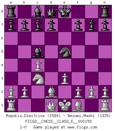 Last move : 1-0 2016 December 6 7:43:43 [Event "FICGS__CHESS__CLASS_E__000193"] [Site "FICGS"] [Date "2016.10.08"] [Round "1"] [White "Ropokis,Dimitrios"] [Black "Nezumi,Mashi"] [Result "1-0"] [WhiteElo "1584"] [BlackElo "1335"] 1.d4 Nf6 2.c4 e5 3.dxe5 Ng4 4.Nf3 Bc5 5.e3 Nc6 6.Bd2 Ngxe5 7.Nxe5 Nxe5 8.Nc3 1-0 This chess game has been lost on time (started : 2016.10.08 20:8:27) Budapest : Adler variation Player White won this chess game. Follow this game move after move (download)Don't even mention losing to me. I can't stand to think of it. (Bobby Fischer) Ich habe kein Problem mit Frauen, sondern nur mit dem Niveau ihres Schachspiels (Judith Polgar) Si el ingenio solamente fuese necesario para lucirse, las mujeres serían las mejores jugadoras de Ajedrez del mundo. (Albin) Donnez-moi un Cavalier en 6e et je gagnerais toutes mes parties. (Steinitz) No man has ever achieved immortality in his own life time. (Unknown)
