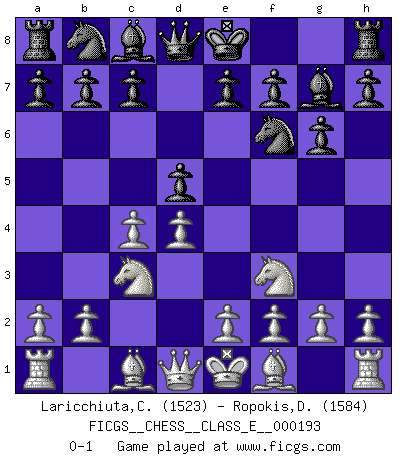 Last move : 0-1 2016 November 24 18:18:53 [Event "FICGS__CHESS__CLASS_E__000193"] [Site "FICGS"] [Date "2016.10.08"] [Round "1"] [White "Laricchiuta,Claudio"] [Black "Ropokis,Dimitrios"] [Result "0-1"] [WhiteElo "1523"] [BlackElo "1584"] 1.Nf3 g6 2.d4 Nf6 3.c4 d5 4.Nc3 Bg7 0-1 This chess game has been lost on time (started : 2016.10.08 20:8:27) Reti Opening Player Black won this chess game. Follow this game move after move (download)Only the player with the initiative has the right to attack. (Wilhelm Steinitz) Das Schachspiel übertrifft alle anderen Spiele so weit wie der Chimborasso einen Misthaufen. (Arthur Schopenhauer) Tu sabes, camarada Pachman, no disfruto el ser un Ministro, preferería jugar al Ajedrez como tu. (Che Guevara) Les Echecs ont trois composantes : le temps, l'espace et le matériel en dernier. (Mikhail Tal) Everything in life is luck. (Donald Trump)