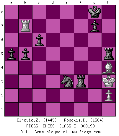 Last move : 0-1 2017 April 9 7:24:36 [Event "FICGS__CHESS__CLASS_E__000193"] [Site "FICGS"] [Date "2016.10.08"] [Round "1"] [White "Cirovic,Zeljko"] [Black "Ropokis,Dimitrios"] [Result "0-1"] [WhiteElo "1445"] [BlackElo "1584"] 1.e4 e5 2.Nf3 Nf6 3.Nxe5 d6 4.Nf3 Nxe4 5.d4 d5 6.Bd3 Bd6 7.Nc3 Nxc3 8.bxc3 Nd7 9.O-O O-O 10.a4 a5 11.c4 dxc4 12.Bxc4 Nf6 13.Bg5 h6 14.Bh4 Bf5 15.c3 Rc8 16.Ne5 Bxe5 17.dxe5 Qxd1 18.Rfxd1 Nd7 19.f4 Nb6 20.Bb5 c6 21.Bd3 Bxd3 22.Rxd3 Nc4 23.Rd7 b5 24.g4 Nb6 25.Rb7 Nxa4 26.c4 Nc5 27.Rb6 Nb3 28.Re1 Nd2 29.Kg2 Nxc4 30.Rb7 Rfe8 31.g5 hxg5 32.Bxg5 f6 33.Bh4 fxe5 34.fxe5 Rxe5 35.Rd1 Ne3+ 36.Kf3 Nxd1 37.Bg3 Rf8+ 38.Kg2 Ne3+ 39.Kh3 Rh5+ 40.Bh4 Rf3+ 0-1 Petrov : Classical attack, Marshall variation Kingside Castling by player White (move 9) Kingside Castling by player Black (move 9) Player Black won this chess game. Follow this game move after move (download)It is not enough to be a good player... you must also play well. (Siegbert Tarrasch) Modernes Schach sorgt sich zuviel um Dinge wie Bauernstruktur usw. Vergessen Sie das, Schachmatt beendet das Spiel! (Nigel Short) Hay jugadores fuertes y personas amables y yo soy un jugador fuerte. (Bobby Fischer) Même si l'adversaire joue le coup analysé précédemment, recommencez l'analyse en voyant la nouvelle position. Première règle de Blumenfeld Imagination is more important than knowledge. Knowledge is limited. Imagination encircles the world. (Albert Einstein)