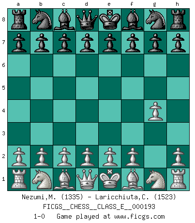 Last move : 1-0 2016 November 25 6:33:30 [Event "FICGS__CHESS__CLASS_E__000193"] [Site "FICGS"] [Date "2016.10.08"] [Round "1"] [White "Nezumi,Mashi"] [Black "Laricchiuta,Claudio"] [Result "1-0"] [WhiteElo "1335"] [BlackElo "1523"] 1.g4 1-0 This chess game has been lost on time (started : 2016.10.08 20:8:27) Grob's attack Player White won this chess game. Follow this game move after move (download)By this measure (on the gap between Fischer & his contemporaries), I consider him the greatest world champion. (Garry Kasparov) Mein Name ist Rustam Kamsky. Sie haben meinen Sohn belästigt. Bereiten Sie sich aufs Sterben vor. (Rustam Kamsky) Cualquier cambio de material en una posición debe venir por medio de un mate, una captura o promoción de Peón. (Purdy) Toute estimation doit être constamment réévaluée. (Jacob Estrin) My poor ole parrot... Is not in the circulation of displays ....poo hoo hoo :) (Wayne Lowrance's enigma)