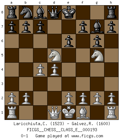 Last move : 0-1 2016 November 21 5:39:13 [Event "FICGS__CHESS__CLASS_E__000193"] [Site "FICGS"] [Date "2016.10.08"] [Round "1"] [White "Laricchiuta,Claudio"] [Black "Galvez,Ricardo"] [Result "0-1"] [WhiteElo "1523"] [BlackElo "1600"] 1.Nf3 Nf6 2.c4 g6 3.Nc3 Bg7 4.d4 d5 5.Bg5 Ne4 6.Nxd5 Nxg5 7.Nxg5 e6 0-1 This chess game has been lost on time (started : 2016.10.08 20:8:27) Reti Opening Player Black won this chess game. Follow this game move after move (download)Chess holds its master in its own bonds, shackling the mind and brain so that the inner freedom of the very strongest must suffer. (Albert Einstein) Die unerbitterlichsten Regeln im Schach sind die Ausnahmen. (Savielly Grigorievitsch Tartakower) El Ajedrez es 99 por ciento táctica. (Teichmann) Tout change constamment, y compris dans le monde des Echecs. (Botvinnik) O divine art of subtlety and secrecy! Through you we learn to be invisible, through you inaudible and hence we can hold the enemy's fate in our hands. (Sun Tzu)