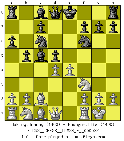 Last move : 1-0 2007 May 11 20:41:3 [Event "FICGS__CHESS__CLASS_F__000032"] [Site "FICGS"] [Date "2007.03.29"] [Round "1"] [White "Oakley,Johnny"] [Black "Podogov,Ilia"] [Result "1-0"] [WhiteElo "1400"] [BlackElo "1400"] 1.e4 e5 2.Nf3 Nc6 3.Bb5 a6 4.Ba4 Nf6 5.O-O Bc5 6.c3 b5 7.Bc2 d5 8.d4 exd4 9.cxd4 1-0 This chess game has been lost on time (started : 2007.03.29 14:16:41) Ruy Lopez : Moeller defense Kingside Castling by player White (move 5) Player White won this chess game. Follow this game move after move (download)By playing at Chess then, we may learn: First: Foresight... Second: Circumspection... Third: Caution... And lastly, we learn by Chess the habit of not being discouraged by present bad appearances in the state of our affairs, the habit of hoping for a favorable chance, and that of persevering in the secrets of resources. (Benjamin Franklin) Der Knackpunkt bei der Konzentration ist, daß wir nur durch sie etwas Neues und Ungewöhnliches am Schachbrett finden können. Sie ist der einzige Weg durch neue neue Ideen eine Überraschung zu bereiten. (Garry Kasparov) Si tu oponente te ofrece un empate, trata de averiguar porque piensa él que esta en una posición peor. (Nigel Short) La victoire dans une partie d'Echecs appartient la plupart du temps à celui qui voit un peu plus loin que l'adversaire. (Lasker) Luck never made a man wise. (Seneca, Letters to Lucilius)