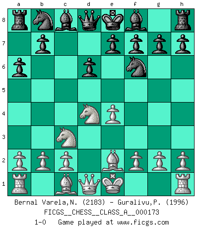 Last move : 1-0 2016 November 28 18:49:7 [Event "FICGS__CHESS__CLASS_A__000173"] [Site "FICGS"] [Date "2016.10.08"] [Round "1"] [White "Bernal Varela,Nelson"] [Black "Guralivu,Paul"] [Result "1-0"] [WhiteElo "2183"] [BlackElo "1996"] 1.e4 c5 2.Nf3 d6 3.d4 cxd4 4.Nxd4 Nf6 5.Nc3 a6 6.Be2 1-0 This chess game has been lost on time (started : 2016.10.08 22:59:20) Sicilian : Najdorf, Opovcensky variation Player White won this chess game. Follow this game move after move (download)Chess is above all, a fight ! (Emanuel Lasker) Das Schach ist nichts für kleine Geister, es beansprucht einen vollen Mann, der sich nicht sklavisch an das Überlieferte hält, sondern selbständig die Tiefen des Spiels zu ergründen sucht. (Wilhelm Steinitz) Cualquier cambio de material en una posición debe venir por medio de un mate, una captura o promoción de Peón. (Purdy) Les Echecs ont trois composantes : le temps, l'espace et le matériel en dernier. (Mikhail Tal) Fear is the path to the dark side. Fear leads to anger; anger leads to hate; hate leads to suffering. I sense much fear in you. (Master Yoda in Star Wars ep.1)