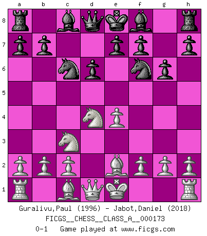 Last move : 0-1 2016 November 24 18:18:53 [Event "FICGS__CHESS__CLASS_A__000173"] [Site "FICGS"] [Date "2016.10.08"] [Round "1"] [White "Guralivu,Paul"] [Black "Jabot,Daniel"] [Result "0-1"] [WhiteElo "1996"] [BlackElo "2018"] 1.e4 c5 2.Nf3 d6 3.d4 cxd4 4.Nxd4 Nf6 5.Nc3 g6 6.Be2 Nc6 0-1 This chess game has been lost on time (started : 2016.10.08 22:59:20) Sicilian : Dragon variation Player Black won this chess game. Follow this game move after move (download)Daring ideas are like Chess men moved forward. They may be beaten, but they may start a winning game. (Johann Wolfgang von Goethe) Schach sollte überall auf der Welt Schulfach werden. Es fördert die geistige Auseinandersetzung. Es lehrt die Demut in der Niederlage. (Garry Kasparov) La vida es como un juego de Ajedrez, cambiando con cada movimiento. (Proverbio Chino) Les Echecs ne sont pas pour les âmes timides. Ils requièrent un homme entier, qui ne s'arrête pas aveuglément à ce qui a été déjà établi, mais qui tente individuellement de sonder les profondeurs du jeu. (W. Steinitz) I don't believe in psychology. I believe in good moves. (Bobby Fischer)