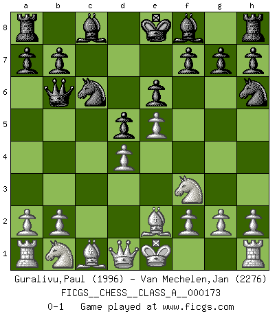 Last move : 0-1 2016 November 20 5:33:52 [Event "FICGS__CHESS__CLASS_A__000173"] [Site "FICGS"] [Date "2016.10.08"] [Round "1"] [White "Guralivu,Paul"] [Black "Van Mechelen,Jan"] [Result "0-1"] [WhiteElo "1996"] [BlackElo "2276"] 1.e4 e6 2.d4 d5 3.e5 c5 4.c3 Nc6 5.Nf3 Qb6 6.Be2 cxd4 7.cxd4 Nh6 0-1 This chess game has been lost on time (started : 2016.10.08 22:59:20) French : Advance, Paulsen attack Player Black won this chess game. Follow this game move after move (download)A Chess game is divided into three stages: the first, when you hope you have the advantage, the second when you believe you have an advantage, and the third... when you know you're going to lose ! (Savielly Tartakower) Der Bart als Geschlechtszeichen mitten im Gesicht ist obszön. Daher gefällt er den Weibern. [Zugegeben, kein Schachzitat, aber unglaublich originell] (Arthur Schopenhauer) El Ajedrez es la vida. (Bobby Fischer) Les échecs sont utiles à l'exercice de la faculté de penser et à celle de l'imagination. Car nous devons posséder une méthode élaborée pour atteindre des buts partout où nous devons conduire notre raison. (Leibnitz) Before all elsed, be armed. (Niccolo Machiavelli)