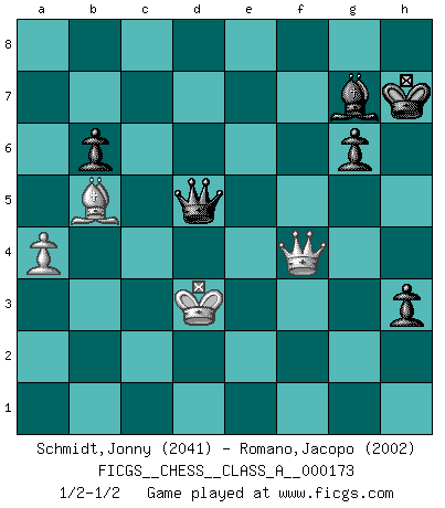 Last move : 1/2-1/2 2017 April 25 23:49:48 [Event "FICGS__CHESS__CLASS_A__000173"] [Site "FICGS"] [Date "2016.10.08"] [Round "1"] [White "Schmidt,Jonny"] [Black "Romano,Jacopo"] [Result "1/2-1/2"] [WhiteElo "2041"] [BlackElo "2002"] 1.e4 c5 2.Nf3 d6 3.Nc3 Nf6 4.d4 cxd4 5.Nxd4 a6 6.Be3 e5 7.Nb3 Be6 8.f3 h5 9.Nd5 Bxd5 10.exd5 Nbd7 11.Qd2 g6 12.Na5 Qc7 13.Be2 Bg7 14.O-O-O Nb6 15.Kb1 Nbxd5 16.Bg5 Rd8 17.Nb3 O-O 18.h3 Rfe8 19.Rhe1 Rc8 20.c3 e4 21.g4 Qd7 22.Rc1 a5 23.Nd4 Rc5 24.Nb3 e3 25.Bxe3 Rxe3 26.Nxc5 dxc5 27.Rcd1 Qa4 28.g5 Nxc3+ 29.bxc3 Nd5 30.Qxd5 Rxc3 31.Rd2 Qb4+ 32.Rb2 Rc1+ 33.Kxc1 Qxb2+ 34.Kd1 Qa1+ 35.Kc2 Qxe1 36.Bc4 Kh7 37.Qxf7 Qf2+ 38.Kc1 Qe3+ 39.Kc2 Qxg5 40.Qg8+ Kh6 41.Qd5 Qg3 42.Qxc5 Qxf3 43.Qxa5 Qxh3 44.Qd2+ Kh7 45.a4 Qh4 46.Kb3 b6 47.Qe3 Qh1 48.Bb5 h4 49.Kc2 Qg2+ 50.Kd3 h3 51.Qf4 Qd5+ 1/2-1/2 Sicilian Queenside Castling by player White (move 14) Kingside Castling by player Black (move 17) 10 pieces endgame at move 43 : White KQBP , Black KQBPPP WHITE : King + 1 Queen 1 Bishop 1 Pawn BLACK : King + 1 Queen 1 Bishop 3 Pawns This chess game ended in a draw. Follow this game move after move (download)Blessed be the memory of him who gave the world this immortal game. (A. G. Gardiner) Der Schachmeister von Heute braucht Courage, einen Killerinstinkt, Ausdauer und Arroganz. (Larry Evans) Repentinamente, me resultaba obvio en mi analisis que yo había pasado por alto lo que Fischer había visto en el tablero con la mas grande facilidad. (Mikhail Botvinnik) RxDa4 pat (...) God is an atheist. (Unknown)