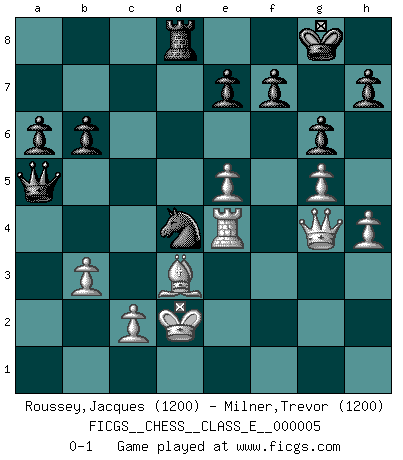 Last move : 0-1 2006 July 2 12:7:36 [Event "FICGS__CHESS__CLASS_E__000005"] [Site "FICGS"] [Date "2006.05.31"] [Round "1"] [White "Roussey,Jacques"] [Black "Milner,Trevor"] [Result "0-1"] [WhiteElo "1200"] [BlackElo "1200"] 1.e4 c5 2.Nf3 Nc6 3.d4 cxd4 4.Nxd4 g6 5.Be3 Nf6 6.f3 Bg7 7.Nc3 d6 8.Qd2 O-O 9.g4 Be6 10.h4 d5 11.O-O-O Nxd4 12.Bxd4 dxe4 13.g5 Nh5 14.fxe4 Bxd4 15.Qxd4 Qc7 16.e5 Rfd8 17.Qe3 Rxd1+ 18.Kxd1 Bxa2 19.Nxa2 Qc6 20.Rh2 Qd5+ 21.Bd3 Qxa2 22.b3 Rf8 23.Qf3 Qa1+ 24.Kd2 b6 25.Qe3 Kh8 26.Rf2 Ng7 27.Qh3 Kg8 28.Re2 Ne6 29.Bc4 Rd8+ 30.Bd3 a6 31.Qg4 Nd4 32.Re4 Qa5+ 0-1 Sicilian defense Kingside Castling by player Black (move 8) Queenside Castling by player White (move 11) Player Black won this chess game. Follow this game move after move (download)The King is a fighting piece. Use it ! (Wilhelm Steinitz) Es hat in meinem Leben Zeiten gegeben, in denen das Schachspiel, wenn nicht zum Lebenszweck, so doch zu einem regelrechten Lebensersatz geworden ist. Man fühlt sich in solchen Zeiten nicht so, als besäße man eine göttliche Gabe, sondern eher so, als sei man von ihr besessen. (Garry Kasparov) EL Ajedrez es como la vida. (Boris Spassky) La tactique est l'élément le plus important du milieu de jeu. (Siegbert Tarrasch) Over-the-board chess is the favorite of mortals, correspondence chess is the favorite of the gods. (Eduard Dyckhoff)