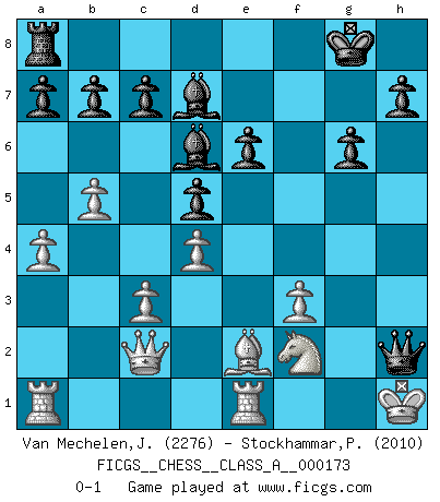 Last move : 0-1 2016 November 21 18:27:28 [Event "FICGS__CHESS__CLASS_A__000173"] [Site "FICGS"] [Date "2016.10.08"] [Round "1"] [White "Van Mechelen,Jan"] [Black "Stockhammar,Par"] [Result "0-1"] [WhiteElo "2276"] [BlackElo "2010"] 1.d4 f5 2.Nc3 Nf6 3.Bg5 e6 4.e4 fxe4 5.Nxe4 Be7 6.Bxf6 Bxf6 7.Nf3 Be7 8.Bd3 d5 9.Ng3 Nc6 10.c3 Bd6 11.O-O Bd7 12.Qc2 Qf6 13.Rfe1 g6 14.b4 O-O 15.b5 Nd8 16.Nf1 Qg7 17.Ne3 Rxf3 18.gxf3 Nf7 19.a4 Ng5 20.Be2 Qh6 21.Ng4 Nh3+ 22.Kh1 Nxf2+ 23.Nxf2 Qxh2+ 0-1 Dutch Kingside Castling by player White (move 11) Kingside Castling by player Black (move 14) Player Black won this chess game. Follow this game move after move (download)Chess is above all, a fight ! (Emanuel Lasker) Wenn Schach ein enormer Dschungel ist, der seine Myriaden von Geheimnissen nicht preisgeben will, dann sind Computer die Kettensägen einer gewaltigen ökologisch unsensiblen Nutzholzfirma. (Nigel Short) Antes de los Finales, los dioses han colocado el Juego Medio. (Siegbert Tarrasch) Le génie consiste à savoir transgresser les règles au moment opportun. (Teichmann) Always be a first-rate version of yourself, instead of a second-rate version of somebody else. (Judy Garland)