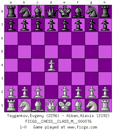 Last move : 1-0 2016 December 16 8:48:59 [Event "FICGS__CHESS__CLASS_M__000076"] [Site "FICGS"] [Date "2016.10.09"] [Round "1"] [White "Tsygankov,Evgeny"] [Black "Alban,Alexis"] [Result "1-0"] [WhiteElo "2296"] [BlackElo "2192"] 1.d4 1-0 This chess game has been lost on time (started : 2016.10.09 11:12:28) Queen's pawn Player White won this chess game. Follow this game move after move (download)Chess is so inspiring that I do not believe a good player is capable of having an evil thought during the game. (Wilhelm Steinitz) Matt entspricht nicht immer den Tatsachen. (Savielly Grigorievitsch Tartakower) No nos podemos resistir a la fascinación de un sacrificio ya que la pasión por los sacrificios es parte de la naturaleza de un jugador de Ajedrez. (Rudolf Spielman) Même si l'adversaire joue le coup analysé précédemment, recommencez l'analyse en voyant la nouvelle position. Première règle de Blumenfeld The hypothalamus is one of the most important parts of the brain, involved in many kinds of motivation, among other functions. The hypothalamus controls the 'Four Fs: Fighting, Fleeing, Feeding and Mating. (Unknown author)