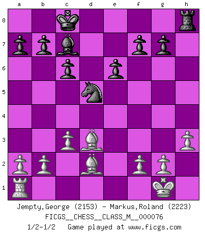 Last move : 1/2-1/2 2017 January 8 0:8:53 [Event "FICGS__CHESS__CLASS_M__000076"] [Site "FICGS"] [Date "2016.10.09"] [Round "1"] [White "Jempty,George"] [Black "Markus,Roland"] [Result "1/2-1/2"] [WhiteElo "2153"] [BlackElo "2223"] 1.e4 c6 2.Nc3 d5 3.Nf3 Bg4 4.h3 Bxf3 5.Qxf3 e6 6.d4 Nf6 7.Bd3 dxe4 8.Nxe4 Qxd4 9.c3 Qd8 10.O-O Nxe4 11.Bxe4 Bd6 12.Rd1 Qc7 13.Qd3 Be5 14.Bxh7 Nd7 15.Be4 O-O-O 16.Qf3 Nf6 17.Rxd8+ Qxd8 18.Bd3 Bc7 19.Bg5 Qd5 20.Qxd5 Nxd5 21.Bd2 1/2-1/2 Caro-Kann : Two knights, 3...Bg4 Kingside Castling by player White (move 10) Queenside Castling by player Black (move 15) This chess game ended in a draw. Follow this game move after move (download)I'd rather have a Pawn than a finger. (Reuben Fine) Man kann eine Schachpartie nur gewinnen, wenn das Gleichgewicht gestört ist. In einer Stellung mit ungestörtem Gleichgewicht ist auch das größte Genie hilflos - in der Stellung steckt dann eben kein genialer Einfall. (Wilhelm Steinitz) La batalla por la última verdad nunca sera ganada. Y es por eso que el Ajedrez es tan fascinante. (Hans Kmoch) Tous ces prétendus hommes politiques sont les pions, les Cavaliers, les Tours ou les Fous d'une partie d'échecs qui se jouera tant qu'un hasard ne renversera pas l'échiquier. (Honoré de Balzac) Never risk one's whole fortune unless supported by one's entire army. (Niccolo Machiavelli)