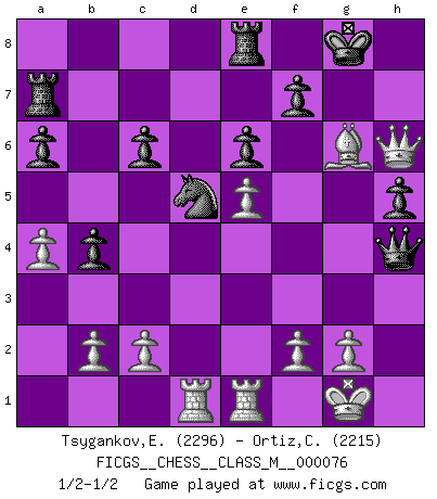 Last move : 1/2-1/2 2016 December 7 11:49:37 [Event "FICGS__CHESS__CLASS_M__000076"] [Site "FICGS"] [Date "2016.10.09"] [Round "1"] [White "Tsygankov,Evgeny"] [Black "Ortiz,Clodomiro"] [Result "1/2-1/2"] [WhiteElo "2296"] [BlackElo "2215"] 1.e4 g6 2.d4 Bg7 3.Nc3 d6 4.Nf3 Nf6 5.Be2 O-O 6.O-O e6 7.Re1 Nc6 8.Bb5 Ne7 9.e5 Nd7 10.Qe2 a6 11.Bd3 b5 12.Bg5 Bb7 13.Rad1 h6 14.Bf4 dxe5 15.Nxe5 Re8 16.a4 Nxe5 17.Bxe5 b4 18.Ne4 Bxe4 19.Bxe4 c6 20.h4 h5 21.Qf3 Qb6 22.Qf4 Nd5 23.Qg3 Bxe5 24.dxe5 Ra7 25.Qg5 Qd8 26.Qh6 Qxh4 27.Bxg6 1/2-1/2 Robatsch defense : Two knights variation Kingside Castling by player Black (move 5) Kingside Castling by player White (move 6) This chess game ended in a draw. Follow this game move after move (download)Before the endgame, the Gods have placed the middle game. (Siegbert Tarrasch) Ich spiele 70 Eröffnungssysteme. (Viktor Kortschnoi) Una partida de Ajedrez se divide en 3 etapas: la primera cuando piensas que tienes la ventaja, la segunda cuando crees que tienes la ventaja y la tercera... ¡cuando te das cuenta que vas a perder!. (Savielly Tartakower) Les pièces de l'échiquier étaient impitoyables. Elles le retenaient, elles l'absorbaient. Il y avait de l'horreur en cela, mais aussi une harmonie unique. Car, qu'y a-t-il dans le monde, à part les échecs ? (V. Nabokov) The quality of decision is like the well-timed swoop of a falcon which enables it to strike and destroy its victim. (Sun Tzu)