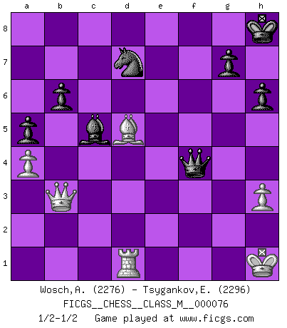 Last move : 1/2-1/2 2017 April 15 10:18:21 [Event "FICGS__CHESS__CLASS_M__000076"] [Site "FICGS"] [Date "2016.10.09"] [Round "1"] [White "Wosch,Arkadiusz"] [Black "Tsygankov,Evgeny"] [Result "1/2-1/2"] [WhiteElo "2276"] [BlackElo "2296"] 1.e4 e5 2.Nf3 Nc6 3.Bc4 Bc5 4.c3 Nf6 5.d3 d6 6.O-O h6 7.b4 Bb6 8.a4 a5 9.b5 Ne7 10.Nbd2 Ng6 11.Re1 O-O 12.h3 Re8 13.Qb3 Re7 14.Qd1 Re8 15.d4 c6 16.Bd3 Be6 17.Ba3 Rc8 18.Bf1 cxb5 19.Bxb5 Re7 20.d5 Bxh3 21.gxh3 Nf4 22.Bf1 Rxc3 23.Qb1 Ba7 24.Qb5 Rd7 25.Bb2 Rc5 26.Qb3 Rdc7 27.Rec1 Qc8 28.Rxc5 Rxc5 29.Nxe5 dxe5 30.Bxe5 Ng6 31.Bd4 Rxd5 32.exd5 Bxd4 33.Rd1 Qf5 34.Nf3 Bc5 35.d6 b6 36.Nd4 Qe5 37.Bc4 Nf4 38.d7 Nxd7 39.Bxf7+ Kh8 40.Ne6 Qe2 41.Nxf4 Qxf2+ 42.Kh1 Qxf4 43.Bd5 1/2-1/2 Giuoco Piano Kingside Castling by player White (move 6) Kingside Castling by player Black (move 11) This chess game ended in a draw. Follow this game move after move (download)Chess is a fairy tale of 1001 blunders. (Savielly Tartakower) Im Reiche der Wirklichkeit ist man nie so glücklich wie im Reiche der Gedanken. (Arthur Schopenhauer) Todo lo que importa ante el tablero de Ajedrez son buenas jugadas. (Bobby Fischer) Le thème de l'attaque double intervient d'une manière ou d'une autre dans l'immense majorité des combinaisons. (Youri Averbakh) Those parts of the system that you can hit with a hammer (not advised) are called hardware; those program instructions that you can only curse at are called software. (Anonymous)