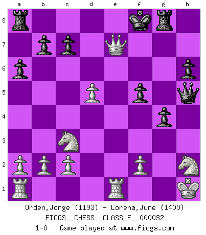 Last move : 1-0 2007 June 16 5:51:39 [Event "FICGS__CHESS__CLASS_F__000032"] [Site "FICGS"] [Date "2007.03.29"] [Round "1"] [White "Orden,Jorge"] [Black "Lorena,June"] [Result "1-0"] [WhiteElo "1193"] [BlackElo "1400"] 1.e4 e5 2.Nf3 Nc6 3.Bb5 Nf6 4.Nc3 a6 5.Bxc6 dxc6 6.O-O Bg4 7.d3 Bc5 8.Bg5 h6 9.Bh4 g5 10.Bg3 Nh5 11.h3 Be6 12.Bxe5 Rg8 13.d4 Bd6 14.d5 cxd5 15.exd5 Bf5 16.Bxd6 Qxd6 17.Re1+ Kf8 18.g4 Bxg4 19.hxg4 Qb4 20.gxh5 Qg4+ 21.Kh1 Qxh5+ 22.Nh2 g4 23.Qe2 f5 24.Qe7+ 1-0 Ruy Lopez : Berlin defense Kingside Castling by player White (move 6) Player White won this chess game. Follow this game move after move (download)Chess is a fairy tale of 1001 blunders. (Savielly Tartakower) Alles was am Schachbrett zählt sind gute Züge. (Robert James Fischer) Bobby solo arroja las piezas y solas caen en las casillas correctas. (Miguel Najdorf ) Mais n'est-ce pas déjà le limiter injurieusement que d'appeler les échecs un jeu? N'est-ce pas aussi une science, un art, ou quelque chose qui, comme le cercueil de Mahomet entre ciel et terre, est suspendu entre l'un et l'autre, et qui réunit un nombre incroyable de contraires ? (Stefan Zweig) But they are useless. They can only give you answers. (Pablo Picasso, about computers)