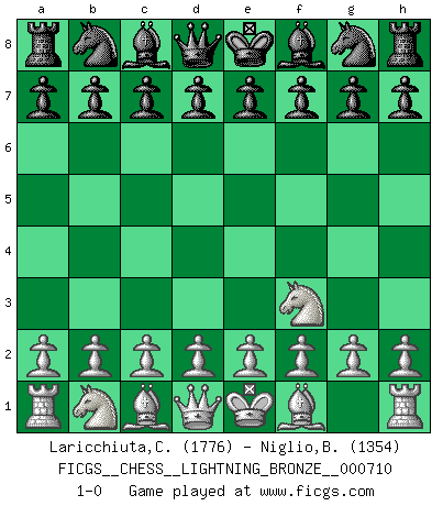 Last move : 1-0 2016 October 9 12:1:4 [Event "FICGS__CHESS__LIGHTNING_BRONZE__000710"] [Site "FICGS"] [Date "2016.10.09"] [Round "1"] [White "Laricchiuta,Claudio"] [Black "Niglio,Biagio"] [Result "1-0"] [WhiteElo "1776"] [BlackElo "1354"] 1.Nf3 1-0 This chess game has been lost on time (started : 2016.10.09 11:17:6) Reti Opening Player White won this chess game. Follow this game move after move (download)I still hope to kill Fischer. (Boris Spassky) Die Arbeit ist etwas Unnatürliches. Die Faulheit allein ist göttlich. (Anatole France) Cada Peón es una Reina en potencia. (James Mason) Botvinnik disait en comparant les échecs à la musique: Il existe une science dont le but est l'étude de l'acoustique et des sons. Mais il y a aussi un art qui se sert de l'océan des sons : c'est la musique. De toute évidence, il en est de même pour la pensée. La logique est l'étude des lois de la réflexion et les échecs reflètent, en tant qu'art, le côté logique de la réflexion, sous la forme d'images artistiques... Extrait de Fischer - Spassky, Reykjavik 1972 par Alexander & F. Wyndham (Ed. Solar), p 37. The beginning of wisdom is silence. The second step is listening. (Unknown)