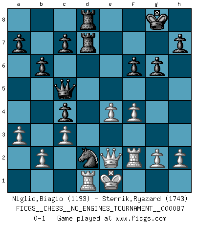 Last move : 0-1 2016 December 3 23:7:43 [Event "FICGS__CHESS__NO_ENGINES_TOURNAMENT__000087"] [Site "FICGS"] [Date "2016.10.12"] [Round "1"] [White "Niglio,Biagio"] [Black "Sternik,Ryszard"] [Result "0-1"] [WhiteElo "1193"] [BlackElo "1743"] 1.e4 e5 2.Nf3 Nc6 3.d4 exd4 4.Nxd4 Bc5 5.Be3 Qf6 6.c3 Nge7 7.Bc4 O-O 8.O-O d6 9.Nxc6 Nxc6 10.Bxc5 dxc5 11.f4 Be6 12.Nd2 Rad8 13.Bxe6 Qxe6 14.Qe2 f6 15.Rfd1 b6 16.Qc4 Rfe8 17.Qe2 g6 18.a3 c4 19.Re1 Rd3 20.Rad1 Red8 21.Rf1 Qd6 22.Rf2 Qc5 23.Kf1 Na5 24.Rf3 R3d7 25.Rf2 Nb3 26.Ke1 Nxd2 0-1 Scotch game Kingside Castling by player Black (move 7) Kingside Castling by player White (move 8) Player Black won this chess game. Follow this game move after move (download)The way he plays Chess demonstrates a man's whole nature. (Stanley Ellin) Schach ist eine Sache der genauen Beurteilung, wann man zuschlagen und wann man sich ducken muss. (Robert James Fischer) El Ajedrez demanda una total concentración. (Bobby Fischer) Les échecs sont un jeu terrible. Si vous n'avez pas le centre, votre adversaire a une position plus libre. Par contre, si vous avez le centre, alors vous avez vraiment quelque chose pour laquelle vous inquiéter ! (Siegbert Tarrasch) You think that education is too expensive ? Try ignorance. (Derek Bok)