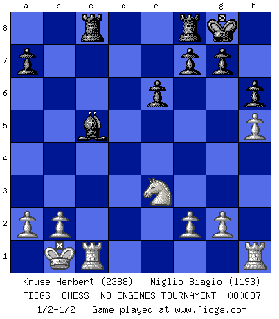 Last move : 1/2-1/2 2016 October 29 19:57:34 [Event "FICGS__CHESS__NO_ENGINES_TOURNAMENT__000087"] [Site "FICGS"] [Date "2016.10.12"] [Round "1"] [White "Kruse,Herbert"] [Black "Niglio,Biagio"] [Result "1/2-1/2"] [WhiteElo "2388"] [BlackElo "1193"] 1.e4 c6 2.d4 d5 3.Nd2 dxe4 4.Nxe4 Bf5 5.Ng3 Bg6 6.h4 h6 7.Nf3 Nd7 8.h5 Bh7 9.Bd3 Bxd3 10.Qxd3 e6 11.Bd2 Ngf6 12.O-O-O Be7 13.Ne4 Nxe4 14.Qxe4 Nf6 15.Qe2 Qd5 16.c4 Qe4 17.Be3 b5 18.Ne5 bxc4 19.Qc2 Qxc2+ 20.Kxc2 Rc8 21.Nxc4 Nd5 22.Kb1 O-O 23.Rc1 c5 24.dxc5 Nxe3 25.Nxe3 Bxc5 1/2-1/2 Caro-Kann : 3.Nd2 Queenside Castling by player White (move 12) Kingside Castling by player Black (move 22) This chess game ended in a draw. Follow this game move after move (download)Look at Garry Kasparov. After he loses, invariably he wins the next game. He just kills the next guy. That's something that we have to learn to be able to do. (Maurice Ashley) Über Karpov: Er war und ist ein Vertreter der russischen Reaktionäre. Das steckt tief in seiner Seele, wehalb ich nicht nett mit ihm umgehen kann. (Viktor Kortschnoi) Por tratar de evitar la pérdida de una pieza, muchas personas han perdido una partida de Ajedrez. (Savielly Tartakover) Le plus grand jeu de l'esprit jamais inventé, plus vous l'apprenez, plus vous y prenez du plaisir. (Garry Kasparov) You can't play chess if you're groggy from pills. (Anatoly Karpov)
