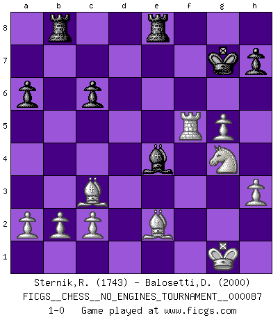 Last move : 1-0 2016 December 23 8:4:45 [Event "FICGS__CHESS__NO_ENGINES_TOURNAMENT__000087"] [Site "FICGS"] [Date "2016.10.12"] [Round "1"] [White "Sternik,Ryszard"] [Black "Balosetti,Davide"] [Result "1-0"] [WhiteElo "1743"] [BlackElo "2000"] 1.e4 c5 2.Nf3 d6 3.d4 cxd4 4.Nxd4 Nf6 5.Nc3 g6 6.Be2 Bg7 7.O-O O-O 8.h3 Nc6 9.Be3 a6 10.f4 e5 11.Nxc6 bxc6 12.fxe5 dxe5 13.Bc5 Qxd1 14.Raxd1 Re8 15.Rd6 Bb7 16.R1xf6 Bxf6 17.Rxf6 Kg7 18.Rf1 Bc8 19.Na4 Be6 20.Bb4 f5 21.Bc3 Bg8 22.exf5 gxf5 23.Rxf5 Kg6 24.g4 Bd5 25.Nb6 Rab8 26.Nd7 Be4 27.Nxe5+ Kh6 28.g5+ Kg7 29.Ng4 1-0 Sicilian : Dragon variation Kingside Castling by player White (move 7) Kingside Castling by player Black (move 7) Player White won this chess game. Follow this game move after move (download)A thorough understanding of the typical mating continuations makes the most complicated sacrificial combinations leading up to them not only not difficult, but almost a matter of course. (Siegbert Tarrasch) Karpov ist ein Museumsstück. (Garry Kasparov) El hombre es un frívolo, una creatura engañosa y como un jugador de Ajedrez, se preocupa mas por el proceso de obtener su meta que de la meta por sí misma. (Dostoyevsky) Le génie consiste à savoir transgresser les règles au moment opportun. (Teichmann) It's not enough to succeed. Others must fail. (Gore Vidal)