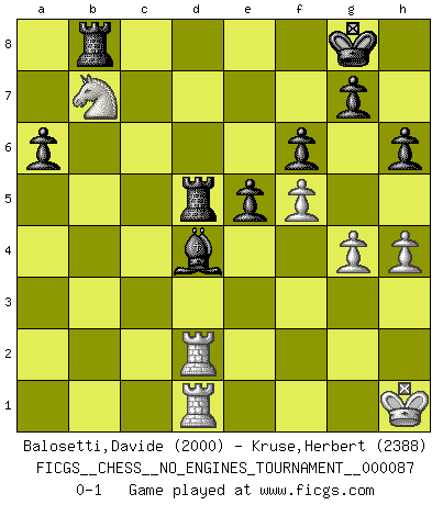 Last move : 0-1 2016 November 17 13:11:48 [Event "FICGS__CHESS__NO_ENGINES_TOURNAMENT__000087"] [Site "FICGS"] [Date "2016.10.12"] [Round "1"] [White "Balosetti,Davide"] [Black "Kruse,Herbert"] [Result "0-1"] [WhiteElo "2000"] [BlackElo "2388"] 1.e4 c5 2.Nf3 d6 3.d4 cxd4 4.Nxd4 Nf6 5.Nc3 a6 6.a4 e5 7.Nb3 Be6 8.Be2 Be7 9.O-O Nc6 10.Be3 O-O 11.f3 Nb4 12.Qd2 d5 13.exd5 Nfxd5 14.Nxd5 Nxd5 15.Kh1 Nxe3 16.Qxe3 Qc7 17.Rfd1 Qxc2 18.Nd2 Qc5 19.Qxc5 Bxc5 20.Ne4 Bd4 21.Ra3 Bxb2 22.Rad3 Bd4 23.f4 Bc4 24.R3d2 Bxe2 25.Rxe2 Rad8 26.a5 f6 27.f5 Rd5 28.Ra2 Rfd8 29.Rad2 Rxa5 30.g4 h6 31.h4 Rf8 32.Nd6 Rd5 33.Nxb7 Rb8 0-1 Sicilian : Najdorf Kingside Castling by player White (move 9) Kingside Castling by player Black (move 10) Player Black won this chess game. Follow this game move after move (download)It is always better to sacrifice your opponent's men. (Savielly Tartakower) Obwohl ich alt bin, darf mir niemand den Finger in den Mund stecken, sonst beisse ich. (Wilhelm Steinitz) Bendita sea la memoria de aquel que dio al mundo este juego inmortal. (A. G. Gardiner) On n'a jamais que l'âge auquel on a commence à jouer aux échecs car après on cesse de vieillir. (Capablanca) Train yourself to let go of everything you fear to lose. (Master Yoda in Star Wars ep.3)
