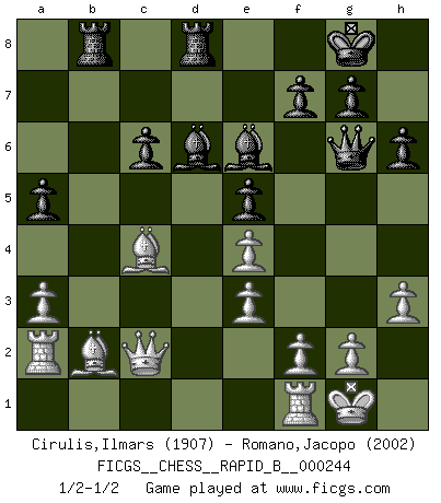 Last move : 1/2-1/2 2016 November 27 15:32:7 [Event "FICGS__CHESS__RAPID_B__000244"] [Site "FICGS"] [Date "2016.10.13"] [Round "1"] [White "Cirulis,Ilmars"] [Black "Romano,Jacopo"] [Result "1/2-1/2"] [WhiteElo "1907"] [BlackElo "2002"] 1.b4 e5 2.a3 d5 3.Bb2 Bd6 4.Nf3 Qe7 5.c4 dxc4 6.e3 Nf6 7.Bxc4 c6 8.Nc3 O-O 9.Qc2 Nbd7 10.Ng5 a5 11.b5 Nc5 12.bxc6 bxc6 13.O-O Rb8 14.d3 Bf5 15.Ra2 h6 16.Nge4 Rfd8 17.Nxf6+ Qxf6 18.Ne4 Nxe4 19.dxe4 Be6 20.h3 Qg6 1/2-1/2 Polish (Sokolsky) opening Kingside Castling by player Black (move 8) Kingside Castling by player White (move 13) This chess game ended in a draw. Follow this game move after move (download)Pawns are born free, yet they are everywhere in chains. (Rick Kennedy) Gott hat gewollt, dass ich Champion werde. (Surab Azmajparaschvili) Aquellos que dicen que entienden al Ajedrez, no entienden nada. (Robert Hubner) La menace est plus forte que l'exécution. (Aaron Nimzovitch) Man is still the most extraordinary computer of all. (John F. Kennedy)