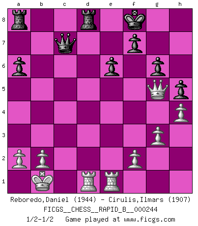 Last move : 1/2-1/2 2016 November 12 21:22:30 [Event "FICGS__CHESS__RAPID_B__000244"] [Site "FICGS"] [Date "2016.10.13"] [Round "1"] [White "Reboredo,Daniel"] [Black "Cirulis,Ilmars"] [Result "1/2-1/2"] [WhiteElo "1944"] [BlackElo "1907"] 1.e4 e6 2.d4 d5 3.Nc3 Nf6 4.Bg5 Be7 5.e5 Nfd7 6.h4 h6 7.Qh5 c5 8.Bxe7 Kxe7 9.O-O-O Nc6 10.Nf3 cxd4 11.Nb5 g6 12.Qg4 a6 13.Nbxd4 Ndxe5 14.Nxe5 Nxe5 15.Qg3 Nc6 16.Qc3 Nxd4 17.Qxd4 h5 18.Bd3 Bd7 19.Rhe1 Bc6 20.Bc4 Kd7 21.Bb3 b5 22.c4 bxc4 23.Bxc4 Ke7 24.Bxd5 Bxd5 25.Qxd5 Qc7+ 26.Kb1 Rhd8 27.Qg5+ Kf8 28.g3 1/2-1/2 French : Albin-Alekhine-Chatard attack Queenside Castling by player White (move 9) This chess game ended in a draw. Follow this game move after move (download)A win by an unsound combination, however showy, fills me with artistic horror. (Wilhelm Steinitz) Es ist schade, dass viele Schachsportler vergessen, wie wichtig Auftreten und angemessene Kleidung sind. (Alexandra Kosteniuk) Ser exitoso en el Ajedrez te permite descubrir tu propia personalidad. Eso es lo que deseo para los niños de mi clase. (Saudin Robovic) On a dit que l'homme se distingue de l'animal par le fait qu'il achète plus de livres qu'il ne peut en lire. Je voudrais suggérer qu'inclure à la liste des livres quelques livres d'échecs rendrait la distinction manifeste. (Edward Lasker) May I never be complete. May I never be content. May I never be perfect. Deliver me, Tyler, from being perfect and complete. (Chuck Palahniuk, Fight Club)