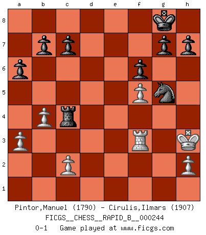 Last move : 0-1 2016 October 26 20:25:11 [Event "FICGS__CHESS__RAPID_B__000244"] [Site "FICGS"] [Date "2016.10.13"] [Round "1"] [White "Pintor,Manuel"] [Black "Cirulis,Ilmars"] [Result "0-1"] [WhiteElo "1790"] [BlackElo "1907"] 1.e4 a6 2.f4 e6 3.Nf3 d5 4.exd5 exd5 5.d4 Nf6 6.Nc3 Bb4 7.Bd2 O-O 8.Be2 Nc6 9.O-O Re8 10.a3 Ba5 11.b4 Bb6 12.Be1 Ng4 13.Bh4 Nxd4 14.Bxd8 Nxe2+ 15.Kh1 Nxc3 16.Qd3 Re3 17.Qd2 Ne4 18.Qxd5 Ngf2+ 19.Kg1 Nh3+ 20.gxh3 Rd3 21.Nd4 Rxd4 22.Qxd4 Bxd4+ 23.Kg2 Bxa1 24.Rxa1 Bxh3+ 25.Kxh3 Rxd8 26.f5 Rd4 27.Re1 Rc4 28.Re3 f6 29.Rf3 Ng5+ 0-1 St. George (Baker) defense Kingside Castling by player Black (move 7) Kingside Castling by player White (move 9) Player Black won this chess game. Follow this game move after move (download)You know you're going to lose. Even when I was ahead I knew I was going to lose. - On playing against Fischer. (Andrew Soltis) Mein Gehirn das ist mein zweitwichtigstes Organ [Aus dem Film: Der Schläfer]. (Woody Allen) Las piezas de Ajedrez son los bloques del alfabeto que moldean los pensamientos; y esos pensamientos, aunque hagan un diseño visual en el tablero, expresan abstractamente su belleza como un poema. (Marcel Duchamp) Les échecs sont un jeu terrible. Si vous n'avez pas le centre, votre adversaire a une position plus libre. Par contre, si vous avez le centre, alors vous avez vraiment quelque chose pour laquelle vous inquiéter ! (Siegbert Tarrasch) The age of a woman doesn't mean a thing. The best tunes are played on the oldest fiddles. (Ralph Waldo Emerson)