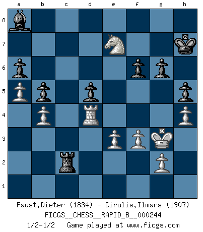 Last move : 1/2-1/2 2016 December 18 16:54:2 [Event "FICGS__CHESS__RAPID_B__000244"] [Site "FICGS"] [Date "2016.10.13"] [Round "1"] [White "Faust,Dieter"] [Black "Cirulis,Ilmars"] [Result "1/2-1/2"] [WhiteElo "1834"] [BlackElo "1907"] 1.c4 a6 2.d4 e6 3.Nc3 d5 4.cxd5 exd5 5.Bf4 Nf6 6.e3 Bd6 7.Bxd6 Qxd6 8.Bd3 O-O 9.h3 b6 10.Nf3 c5 11.O-O Bb7 12.b3 Nbd7 13.a4 Rac8 14.Bf5 Rc7 15.Bxd7 Qxd7 16.a5 b5 17.dxc5 Rxc5 18.Qd4 Rfc8 19.Ne2 Ne4 20.Rac1 h6 21.Rxc5 Nxc5 22.Qb4 Ne6 23.Nfd4 Qd8 24.Rd1 Rc7 25.Nf5 Qf6 26.Ned4 Qd8 27.f3 Kh7 28.Qd6 Qxd6 29.Nxd6 Nxd4 30.Rxd4 Ba8 31.h4 Rc3 32.b4 f6 33.Kf2 Rc2+ 34.Kg3 h5 35.Nf5 g6 36.Ne7 1/2-1/2 English Opening Kingside Castling by player Black (move 8) Kingside Castling by player White (move 11) This chess game ended in a draw. Follow this game move after move (download)It is peculiar but a fact nevertheless, that gamblers in chess always have enthusiastic followers. (Botvinnik) Ich verachte Kasparow. (Viktor Kortschnoi) El Ajedrez detiene a su maestro dentro de sus propios vínculos, encadenando la mente y el cerebro, por lo que la libertad interior del mas fuerte debe sufrir. (Albert Einstein) Nous vivons dans un monde échiquéen : chaque jour qui passe est un défi à relever. (Philosophe Sasha) When I took office, only high energy physicists had ever heard of what is called the World Wide Web... Now even my cat has its own page. (Bill Clinton, 1996)