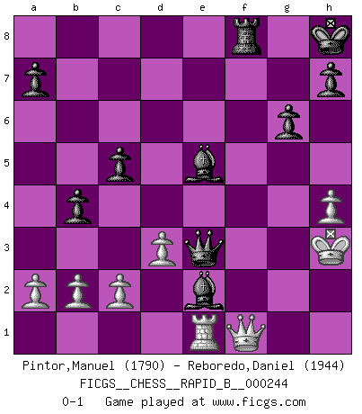 Last move : 0-1 2016 November 18 13:8:45 [Event "FICGS__CHESS__RAPID_B__000244"] [Site "FICGS"] [Date "2016.10.13"] [Round "1"] [White "Pintor,Manuel"] [Black "Reboredo,Daniel"] [Result "0-1"] [WhiteElo "1790"] [BlackElo "1944"] 1.e4 c5 2.Nc3 Nc6 3.g3 g6 4.f4 Bg7 5.Bg2 e6 6.Nf3 Nge7 7.d3 O-O 8.O-O d6 9.h3 Rb8 10.Kh2 b5 11.Rb1 b4 12.Ne2 f5 13.exf5 Nxf5 14.Ng5 d5 15.h4 Qd6 16.Nf3 e5 17.fxe5 Nxe5 18.Nxe5 Bxe5 19.Nf4 Nxh4 20.Bxd5+ Kh8 21.gxh4 Qxd5 22.Kg1 Qd4+ 23.Kg2 Bb7+ 24.Kg3 Rxf4 25.Bxf4 Qe3+ 26.Rf3 Bxf4+ 27.Kg2 Rf8 28.Qf1 Be5 29.Re1 Bxf3+ 30.Kh3 Be2 0-1 Sicilian : Closed Kingside Castling by player Black (move 7) Kingside Castling by player White (move 8) Player Black won this chess game. Follow this game move after move (download)An attack on the wing should be met by play in the center. (Nimzovitch) Ivan Sokolov treibt mich als Beifahrer an mit go Loeky go - . (Loek van Wely) Personalmente, yo prefiero mirar hacia el futuro en donde un programa de computadora gane el título mundial de Ajedrez. La humanidad necesita una lección de humildad. (Richard Dawkings) C'est la seule position que je connaisse où les deux camps sont mals. Propos prêtés à V. Anand. 98% of all statistics are made up. (Author unknown)