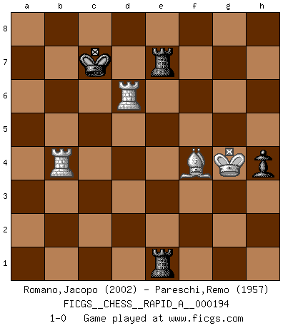 Last move : 1-0 2017 July 24 9:4:24 [Event "FICGS__CHESS__RAPID_A__000194"] [Site "FICGS"] [Date "2016.10.15"] [Round "1"] [White "Romano,Jacopo"] [Black "Pareschi,Remo"] [Result "1-0"] [WhiteElo "2002"] [BlackElo "1957"] 1.e4 e5 2.Nf3 Nc6 3.Bb5 Nge7 4.O-O Ng6 5.c3 Be7 6.Bc4 d6 7.d4 O-O 8.Be3 Kh8 9.d5 Nb8 10.Bd3 c6 11.c4 cxd5 12.cxd5 Na6 13.a3 f5 14.exf5 Bxf5 15.Bxf5 Rxf5 16.Nc3 b6 17.Rc1 Qd7 18.b4 Raf8 19.Qa4 Qxa4 20.Nxa4 Bd8 21.Rc6 Nc7 22.Nc3 Ne8 23.a4 Ne7 24.Rc4 h6 25.Rd1 R5f7 26.Nd2 Nf5 27.Nde4 Kh7 28.b5 Rd7 29.Rd3 Nf6 30.f3 Bc7 31.Kf2 Ne7 32.h3 Bb8 33.Bd2 Nxe4 34.Nxe4 g5 35.g4 Ng6 36.Bc1 Ne7 37.Ba3 Kg6 38.Kg3 Rh8 39.Bb4 R7d8 40.Rc2 Kg7 41.R2c3 Rhf8 42.Rc1 Ng6 43.a5 bxa5 44.Bxa5 Rd7 45.Rc6 Nf4 46.Rd2 Kf7 47.Bb4 Rfd8 48.h4 gxh4+ 49.Kxh4 Ke7 50.Ba3 h5 51.g5 Rb7 52.Nc3 Kf8 53.Rc2 Kf7 54.Bc1 Nd3 55.Ne4 Nb4 56.g6+ Kg7 57.Rg2 Nxd5 58.Bg5 Rh8 59.Rd2 Rxb5 60.Nxd6 Bxd6 61.Rxd6 Rb4+ 62.Kg3 h4+ 63.Kh2 Rh5 64.Rd7+ Kxg6 65.R2xd5 Rb3 66.Re7 Rxf3 67.R7xe5 Kh7 68.Kg2 Rf8 69.Kh3 Kg8 70.Rd6 Rc8 71.Rg6+ Kf7 72.Rf6+ Kg8 73.Rg6+ Kf7 74.Ra6 Kg8 75.Rd5 Rc7 76.Rd8+ Kg7 77.Be3 Kf7 78.Kg4 Re5 79.Bf4 Rc4 80.Rh6 R5e4 81.Rd7+ Kg8 82.Rg6+ Kf8 83.Rf6+ Ke8 84.Rxa7 Rcd4 85.Rh7 Re7 86.Rh8+ Kd7 87.Rb6 Rde4 88.Rd6+ Kc7 89.R8h6 Kc8 90.Rb6 Re1 91.Rb8+ Kd7 92.Rd6+ Kc7 93.Rb4 1-0 Ruy Lopez : Cozio defense Kingside Castling by player White (move 4) Kingside Castling by player Black (move 7) 10 pieces endgame at move 66 : White KRRB , Black KRRPPP WHITE : King + 2 Rooks 1 Bishop BLACK : King + 2 Rooks 3 Pawns 9 pieces endgame at move 67 : White KRRB , Black KRRPP WHITE : King + 2 Rooks 1 Bishop BLACK : King + 2 Rooks 2 Pawns 8 pieces endgame at move 84 : White KRRB , Black KRRP WHITE : King + 2 Rooks 1 Bishop BLACK : King + 2 Rooks 1 Pawn Player White won this chess game. Follow this game move after move (download)Chess is ruthless: you've got to be prepared to kill people. (Nigel Short) Wer der Ansicht ist, daß alle Schachspieler verrückt sind, wird durch Studium des Lebens von Emil Josef Diemer nicht auf andere Gedanken kommen. (Hans Ree) La mitad de las variaciones que son calculadas en una partida de torneo, resultan ser completamente superfluas. Desafortunadamente, nadie sabe por adelantado cual mitad. (Jan Tinman) Aux échecs, l'amour-propre est satisfait quand on remporte la victoire, mais il n'y a pas de honte à être battu. (Benjamin Franklin) Drag your thoughts away from your troubles... by the ears, by the heels, or any other way you can manage it. (Mark Twain)