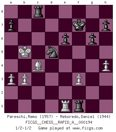 Last move : 1/2-1/2 2016 December 11 21:4:37 [Event "FICGS__CHESS__RAPID_A__000194"] [Site "FICGS"] [Date "2016.10.15"] [Round "1"] [White "Pareschi,Remo"] [Black "Reboredo,Daniel"] [Result "1/2-1/2"] [WhiteElo "1957"] [BlackElo "1944"] 1.d4 Nf6 2.c4 g6 3.Nc3 d5 4.f3 c5 5.dxc5 d4 6.Nb5 Nc6 7.e3 e5 8.exd4 Nxd4 9.Ne2 Bxc5 10.Nexd4 exd4 11.Qe2+ Be6 12.Qe5 Bb4+ 13.Bd2 Bxd2+ 14.Kxd2 O-O 15.Nc7 Rc8 16.Nxe6 fxe6 17.Rd1 b5 18.Kc2 Qd5 19.Qxd4 Rfd8 20.Qxd5 Nxd5 21.Re1 bxc4 22.a3 c3 23.b3 Nf4 24.Bc4 Rd2+ 25.Kxc3 Rxg2 26.Kb4 Nd5+ 27.Kb5 Kf7 28.h4 Rf2 29.Rhf1 Rxf1 1/2-1/2 King's Indian defense, 3.Nc3 Kingside Castling by player Black (move 14) This chess game ended in a draw. Follow this game move after move (download)Before the endgame, the Gods have placed the middle game. (Siegbert Tarrasch) Um dein Spiel zu verbessern musst du zuallererst das Endspiel studieren, denn diese kann unabhängig studiert werden. Die Eröffnung und das Mittelspiel müssen immer in Bezug gesetzt werden zum Endspiel. (José Raúl Capablanca) Fischer es una tragedia del Ajedrez Americano a la par con Morphy y Pillsbury. (Mig Greengard) La tactique est l'élément le plus important du milieu de jeu. (Siegbert Tarrasch) The intuitive mind is a sacred gift; the rational mind is a faithful servant. We have created a society that honors the servant but has forgotten the gift. (Albert Einstein)