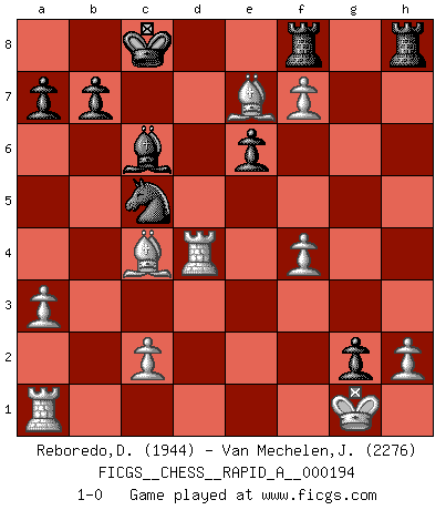 Last move : 1-0 2016 November 28 15:31:11 [Event "FICGS__CHESS__RAPID_A__000194"] [Site "FICGS"] [Date "2016.10.15"] [Round "1"] [White "Reboredo,Daniel"] [Black "Van Mechelen,Jan"] [Result "1-0"] [WhiteElo "1944"] [BlackElo "2276"] 1.e4 e6 2.d4 d5 3.Nc3 Nf6 4.Bg5 Bb4 5.e5 h6 6.Be3 Ne4 7.Qg4 g6 8.a3 Bxc3+ 9.bxc3 c5 10.Bd3 h5 11.Qf4 g5 12.Qf3 Nxc3 13.dxc5 d4 14.Bd2 Bd7 15.Ne2 Bc6 16.Qg3 Nxe2 17.Bxe2 h4 18.Qxg5 Qxg5 19.Bxg5 h3 20.O-O hxg2 21.Rfd1 Nd7 22.Rxd4 f6 23.exf6 O-O-O 24.Bc4 Rdg8 25.f4 Nxc5 26.f7 Rf8 27.Be7 1-0 French : MacCutcheon, Janowski variation Kingside Castling by player White (move 20) Queenside Castling by player Black (move 23) Player White won this chess game. Follow this game move after move (download)All Chess players should have a hobby. (Savielly Tartakower) Wie gewinnt Tal? Er entwickelt alle seine Figuren in die Brettmitte und opfert sie dann irgendwo. (Robert James Fischer) Ayuda a tus piezas para que ellas te puedan ayudar. (Paul Morphy) Celui qui prend des risques peut perdre, celui qui n'en prend pas perd toujours. (Xavier Tartacover) A good aphorism is too hard for the tooth of time, and is not worn away with the centuries, although it serves as food for every speech. (Friedrich Nietzsche)