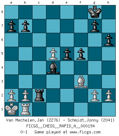 Last move : 0-1 2016 November 14 19:44:10 [Event "FICGS__CHESS__RAPID_A__000194"] [Site "FICGS"] [Date "2016.10.15"] [Round "1"] [White "Van Mechelen,Jan"] [Black "Schmidt,Jonny"] [Result "0-1"] [WhiteElo "2276"] [BlackElo "2041"] 1.e4 c5 2.Nf3 d6 3.d4 cxd4 4.Nxd4 Nc6 5.Nc3 Nf6 6.Bg5 e6 7.Qd2 Be7 8.O-O-O O-O 9.f4 h6 10.Bh4 Nxd4 11.Qxd4 Qa5 12.Be2 e5 13.fxe5 dxe5 14.Qe3 Be6 15.Kb1 Rac8 16.Nd5 Bxd5 17.exd5 Qa4 18.Bxf6 Qxc2+ 19.Ka1 Bxf6 20.Rc1 Bg5 21.Rxc2 Bxe3 22.Rxc8 Rxc8 23.Rd1 Rc2 24.Bf3 Bd4 25.Rb1 f5 0-1 Sicilian Queenside Castling by player White (move 8) Kingside Castling by player Black (move 8) Player Black won this chess game. Follow this game move after move (download)A big shock; the best chess player in history has passed away. (Lajos Portisch, about Bobby Fischer's death) Karpov ist ein Museumsstück. (Garry Kasparov) Una compensación adecuada por un sacrificio es tener una combinación sólida que conduce a una posición ganadora; una compensación adecuada por una metida de pata es dejar a tu oponente arrebatar una derrota de las fauces de la victoria. (Bruce A. Moon) Les échecs, c'est l'art d'analyser. (Mikhail Botvinnik) Life is like a play: it's not the length but the excellence of the acting that matters. (Seneca)