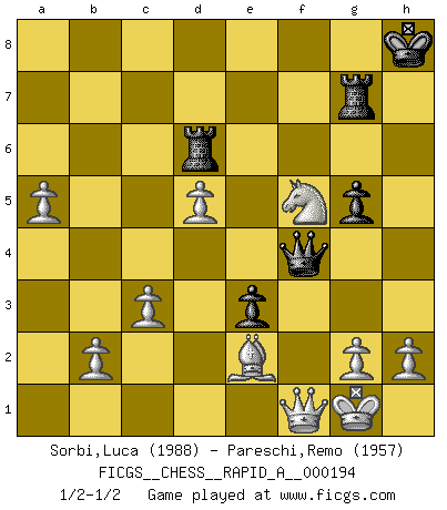 Last move : 1/2-1/2 2016 December 26 6:50:20 [Event "FICGS__CHESS__RAPID_A__000194"] [Site "FICGS"] [Date "2016.10.15"] [Round "1"] [White "Sorbi,Luca"] [Black "Pareschi,Remo"] [Result "1/2-1/2"] [WhiteElo "1988"] [BlackElo "1957"] 1.e4 e5 2.Nf3 Nc6 3.Bb5 Nge7 4.O-O Ng6 5.Nc3 Bc5 6.d3 a6 7.Bc4 h6 8.Be3 d6 9.a4 Nd4 10.Bxd4 exd4 11.Ne2 Bg4 12.Nd2 Qf6 13.f3 Bd7 14.f4 O-O 15.e5 Qh4 16.Ne4 Ba7 17.exd6 cxd6 18.Bb3 d5 19.Bxd5 Ne7 20.Bxb7 Rab8 21.Bxa6 Nd5 22.Bb5 Ne3 23.Qb1 Be6 24.Rf3 Rbc8 25.Rxe3 dxe3 26.c3 f5 27.N4g3 g5 28.Qf1 Bd5 29.a5 Rc5 30.Ba6 Rc7 31.Ra4 Kh8 32.d4 Bb8 33.Rb4 Be4 34.d5 Rg7 35.fxg5 Bd6 36.Rb6 Rd8 37.Bc4 hxg5 38.Rxd6 Rxd6 39.Nxe4 Qxe4 40.Ng3 Qg4 41.Be2 Qf4 42.Nxf5 1/2-1/2 Ruy Lopez : Cozio defense Kingside Castling by player White (move 4) Kingside Castling by player Black (move 14) This chess game ended in a draw. Follow this game move after move (download)Winning isn't everything... but losing is nothing. (Mednis) Schach ist ein Kampf gegen den Fehler. (Johannes Herrman Zukertort) La partida mas dura de ganar es una partida ganada. (Emanuel Lasker) Mais l'homme est une créature légère et illogique : semblable au joueur d'échecs, il n'aime que le processus du but à atteindre, non le but lui-même. (Dostoïevsky) It is not titles that honor men, but men that honor titles. (Niccolo Machiavelli)