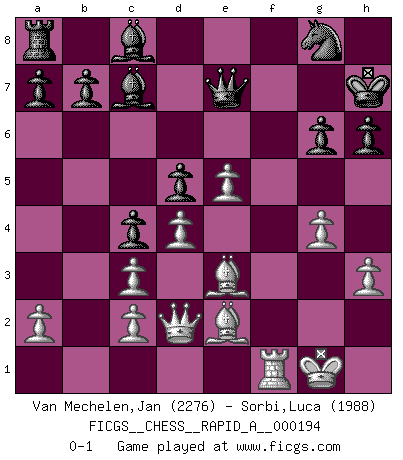 Last move : 0-1 2016 November 24 13:24:3 [Event "FICGS__CHESS__RAPID_A__000194"] [Site "FICGS"] [Date "2016.10.15"] [Round "1"] [White "Van Mechelen,Jan"] [Black "Sorbi,Luca"] [Result "0-1"] [WhiteElo "2276"] [BlackElo "1988"] 1.e4 e5 2.Nf3 Nf6 3.Nxe5 d6 4.Nf3 Nxe4 5.d4 d5 6.Bd3 Nc6 7.Nc3 Nxc3 8.bxc3 Bd6 9.O-O O-O 10.Ng5 g6 11.f4 h6 12.Nf3 Ne7 13.Ne5 c5 14.g4 c4 15.Be2 f6 16.Be3 Bc7 17.Qd2 Kh7 18.h3 fxe5 19.fxe5 Ng8 20.Rxf8 Qxf8 21.Rf1 Qe7 0-1 Petrov : Classical attack Kingside Castling by player White (move 9) Kingside Castling by player Black (move 9) Player Black won this chess game. Follow this game move after move (download)Who is your opponent tonight, tonight I am playing against the Black pieces. (Akiba Rubinstein) Jeder weiß, dass Gasprom Putins persönliches Machtinstrument ist. Die Firma wird vom Kreml aus geleitet und wird schon deshalb nie transparent sein. (Garry Kasparov) El Ajedrez es un mar en el cual un mosquito puede beber y un elefante puede bañarse. (Refrán Hindú) Le jeu d'échecs fait naître et fortifie en nous plusieurs qualités précieuses dans le cours de l'existence, telles que la prévoyance, la circonspection, la prudence, et la persévérance. (Benjamin Franklin - 1783, la morale des échecs) There is no instance of a country having benefited from prolonged warfare. (Sun Tzu)